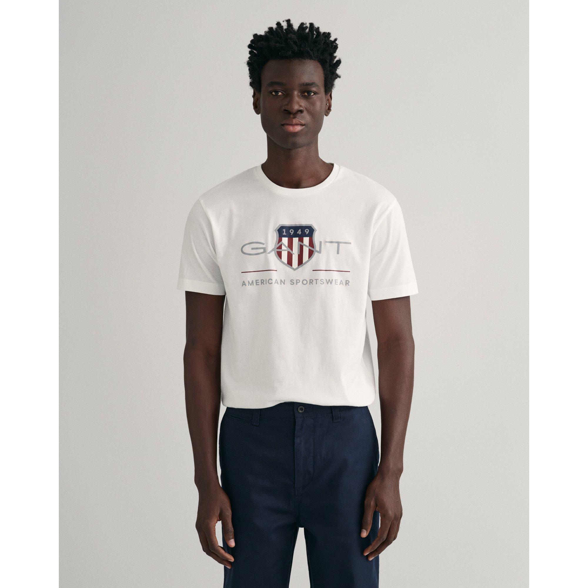 Questa t-shirt a vestibilità regolare è in 100% cotone. Perfetta per completare gli outfit casual, presenta maniche corte, un classico collo rotondo e un badge GANT ispirato agli archivi del brand risalenti agli anni '80, che qui prende la forma di una stampa sul petto.