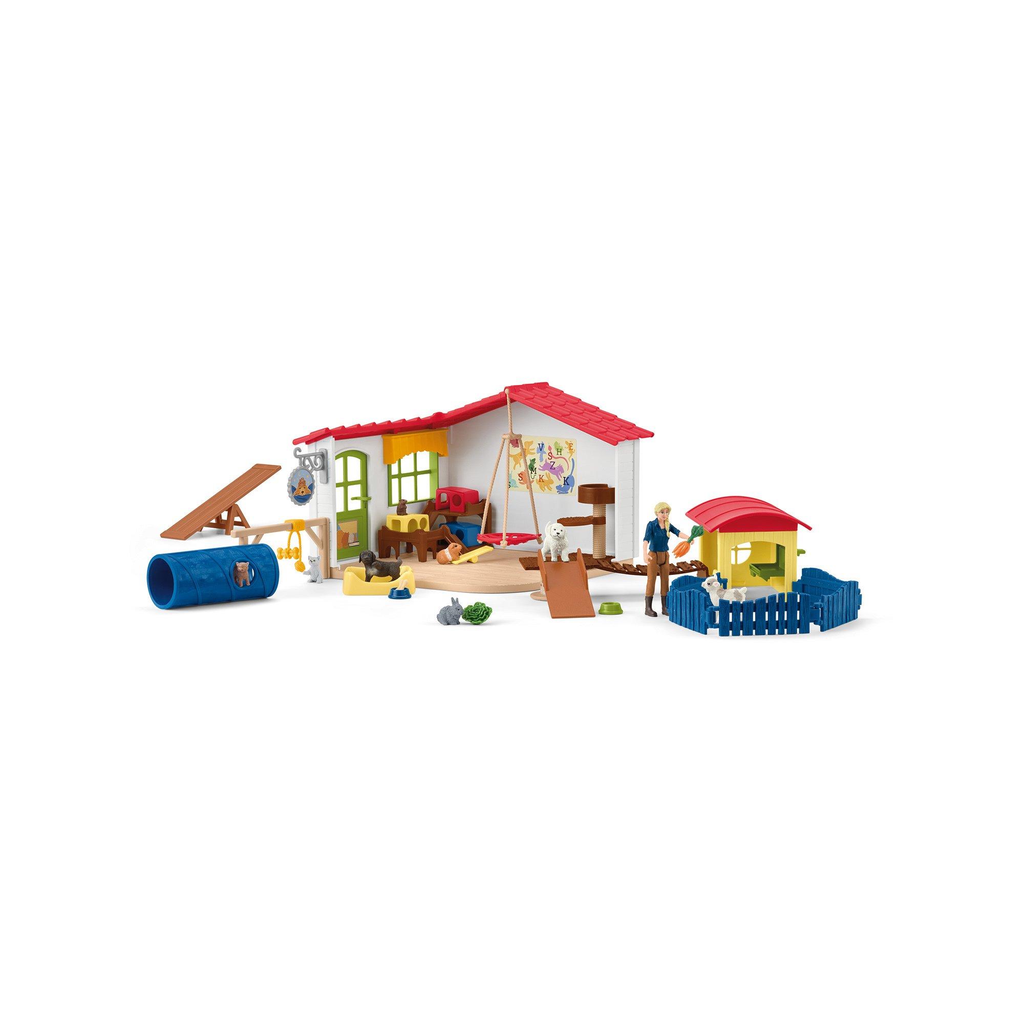Questo Pet Hotel ha tutto ciò che serve! La simpatica guardiana si prende cura dei suoi ospiti animali e ha un posticino per tutti. Criceto, coniglio e porcellino d'India giocano a nascondino nelle loro piccole tane. Ma una foglia di lattuga croccante li fa subito uscire allo scoperto. Nel frattempo, i gattini saltellano intorno al tiragraffi. I due cuccioli preferiscono invece vivere avventure all'aperto: stanno in equilibrio sull'altalena, giocano sullo scivolo e corrono nel tunnel. La capretta osserva con curiosità il variopinto viavai e di tanto in tanto commenta con un belato.