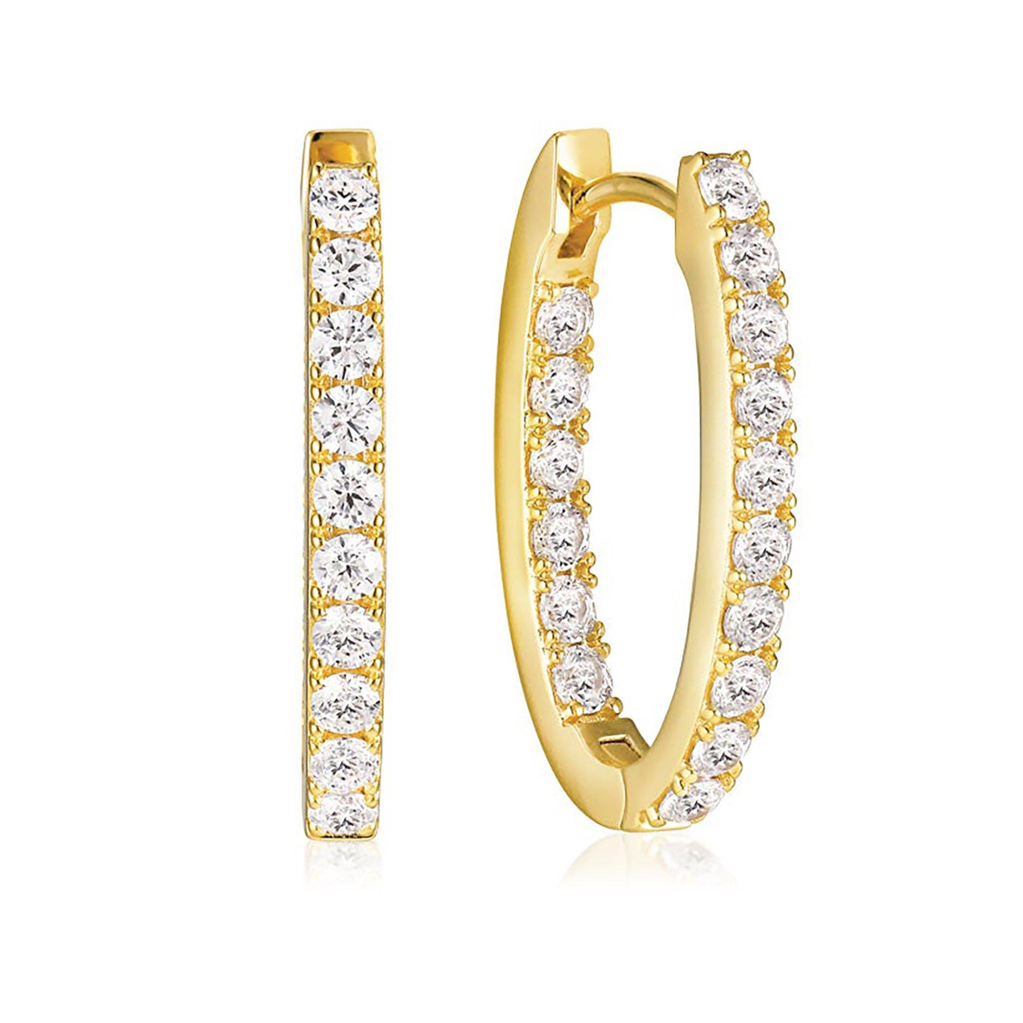 Orecchini in argento sterling 925 placcato oro 18 carati, superficie lucidata, con incastonatura di zirconi bianchi sfaccettati Dimensioni degli orecchini: lunghezza: 23 mm, larghezza: 2,5 mm