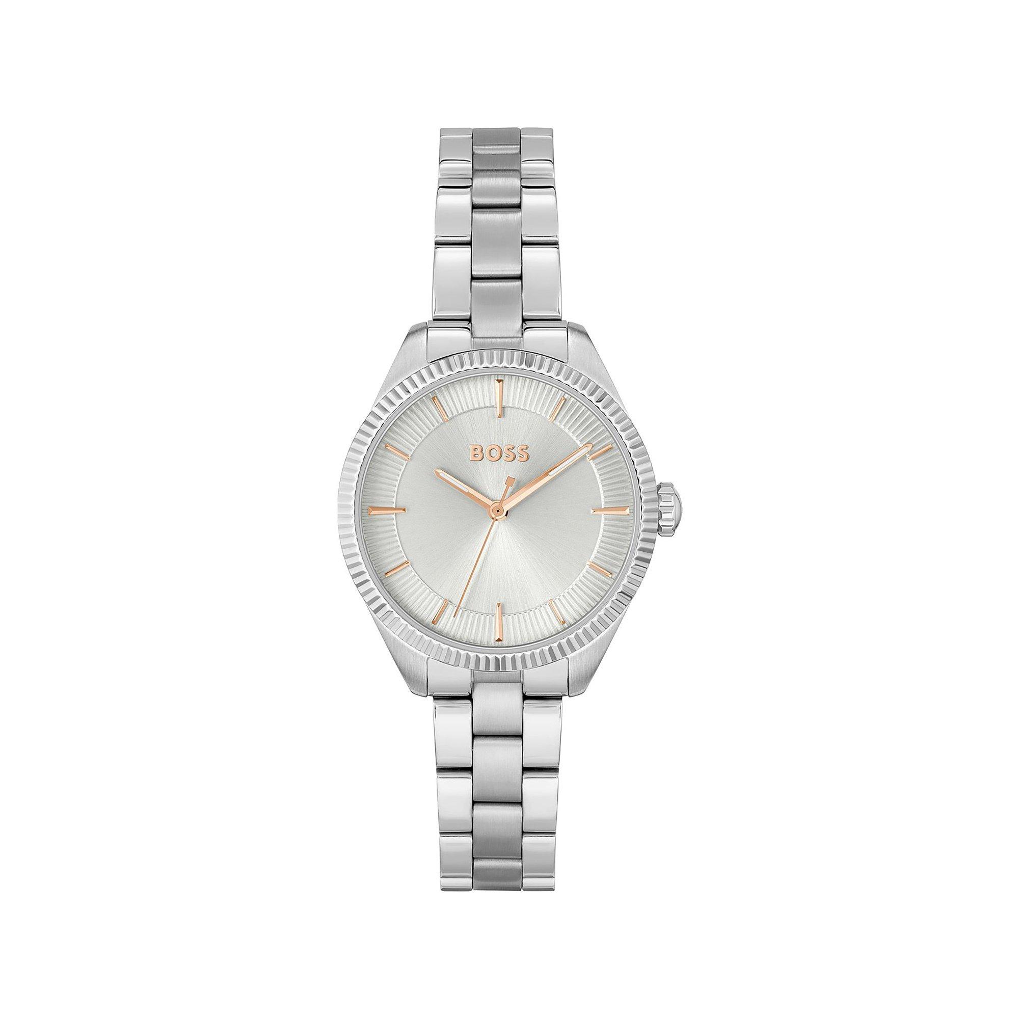 Orologio femminile firmato BOSS in acciaio inossidabile color argento con cinturino a maglie, quadrante bianco color argento, indici di colore contrastante e lunetta scanalata. Movimento: tre lancette Colore del quadrante: bianco argento Materiale del cinturino: acciaio inossidabile Chiusura: fibbia con pulsante Dimensioni della cassa: 32 mm Resistenza all'acqua (in ATM): 3 ATM