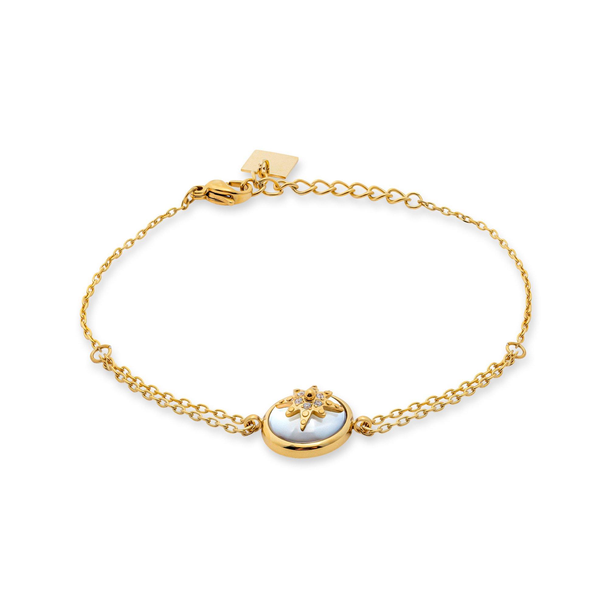 Questo braccialetto firmato Zag Bijoux è realizzato in acciaio inossidabile con un ciondolo in madreperla con pietre ornamentali su una forma nostalgica a stella. La catena regolabile in lunghezza ha un aspetto fragile e molto femminile. La chiusura è dotata di un ciondolo dell'etichetta.