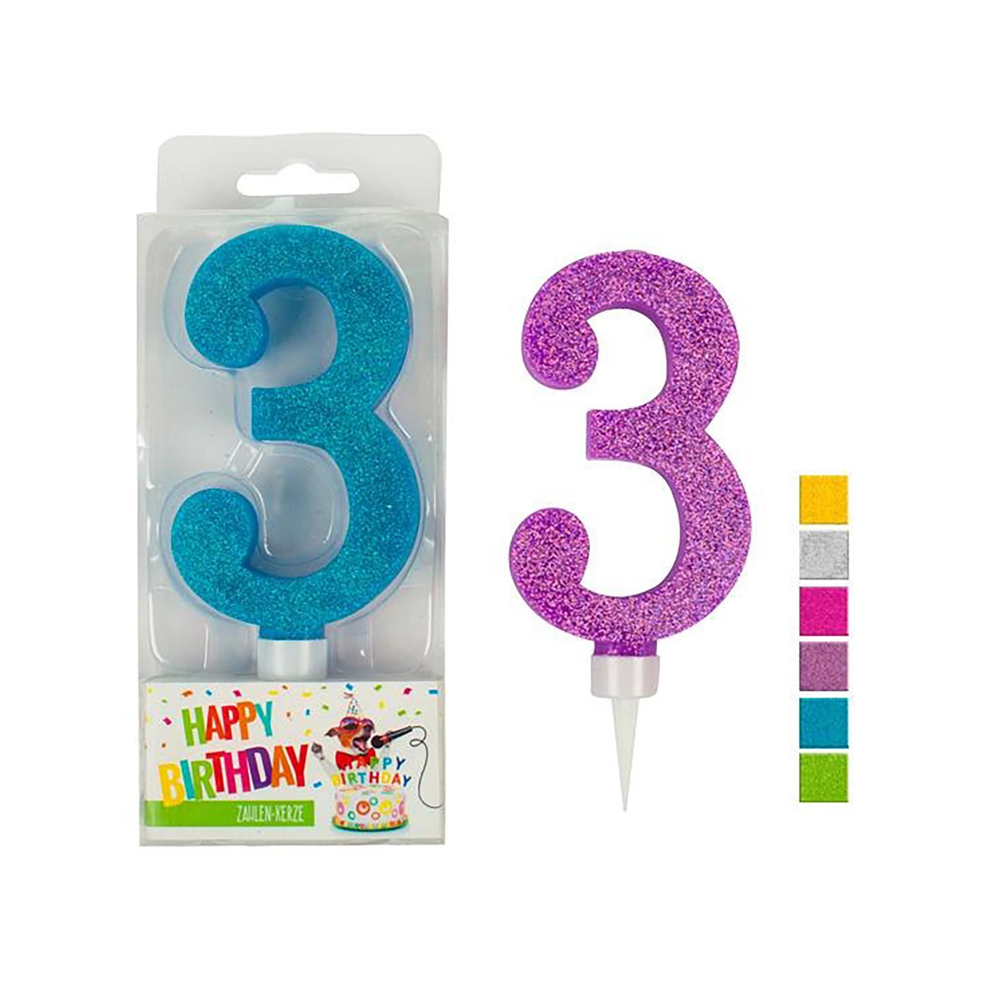Le candele di grande numero con glitter nei colori verde, blu, arancione, rosa, viola e giallo sono un'attrazione per qualsiasi torta. Un must per la vostra festa.