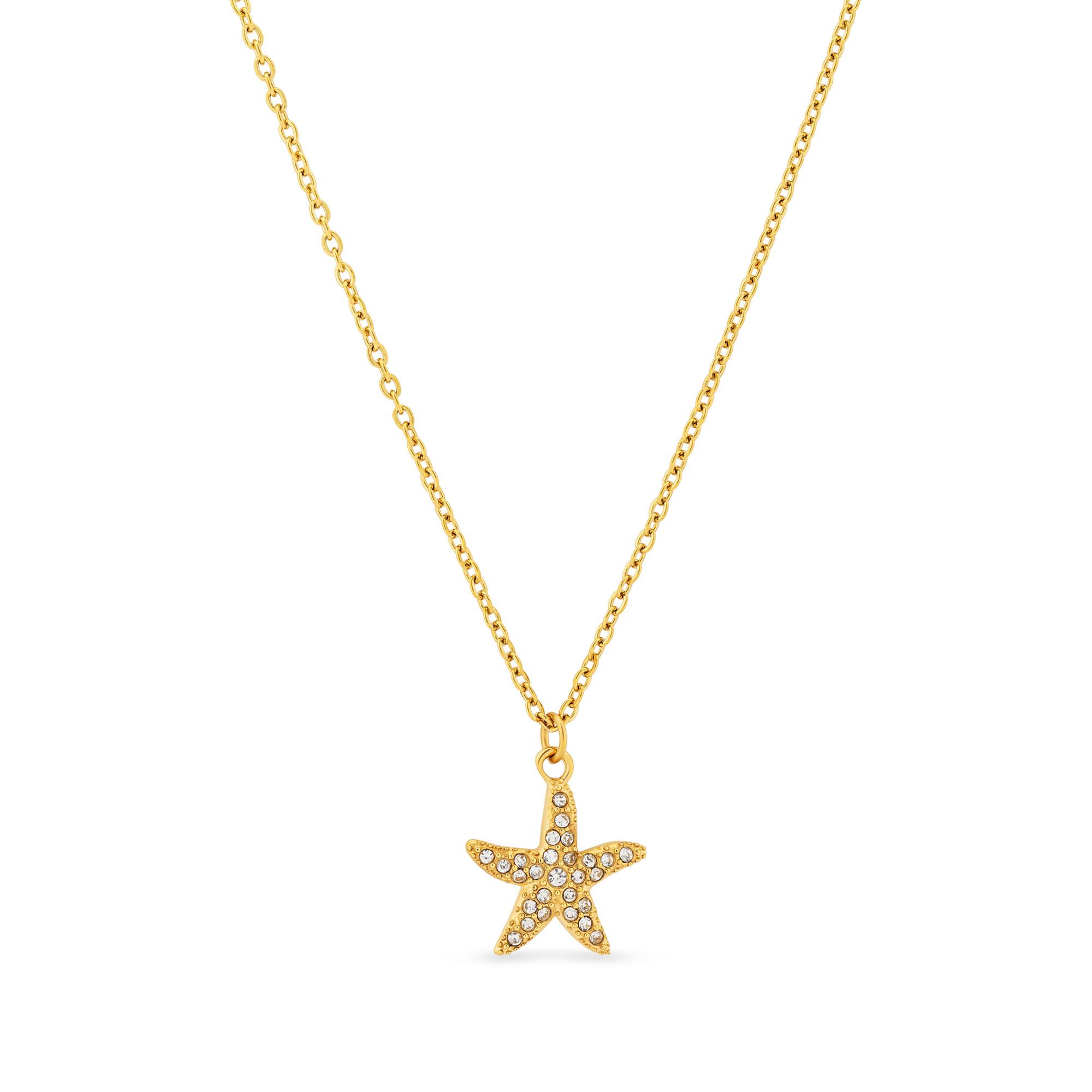 Questa collana firmata L'Atelier è composta da una catena in acciaio inossidabile color oro con un ciondolo a forma di stella marina. La stella marina è incastonata con pietre decorative: un gioiello di tendenza. La catena è regolabile in lunghezza e si chiude con un moschettone.