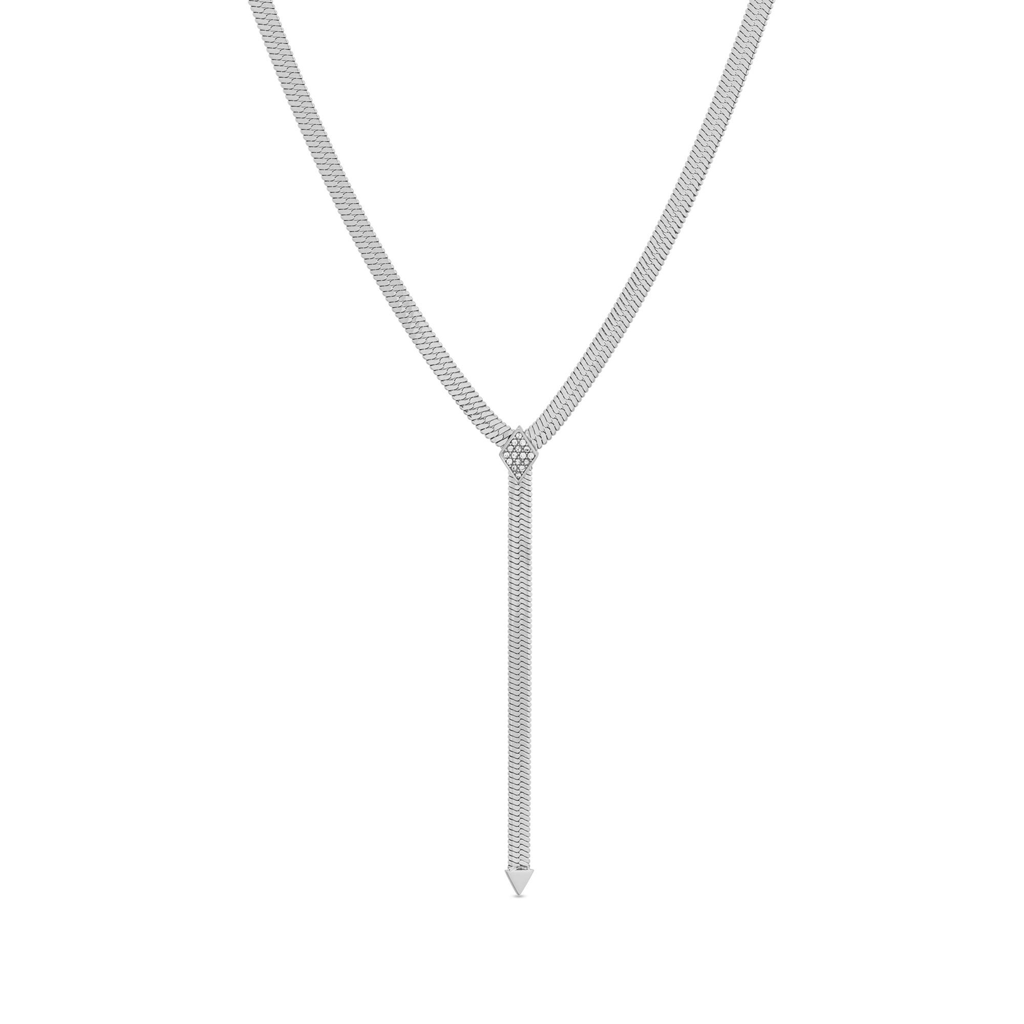 Questo collier morbido firmato L'Atelier in acciaio inossidabile ha una lunghezza variabile. Si chiude con un moschettone, che si adatta perfettamente al design moderno. La catena a serpente ha al centro un rombo incastonato di pietre decorative, che dona un look particolarmente femminile.