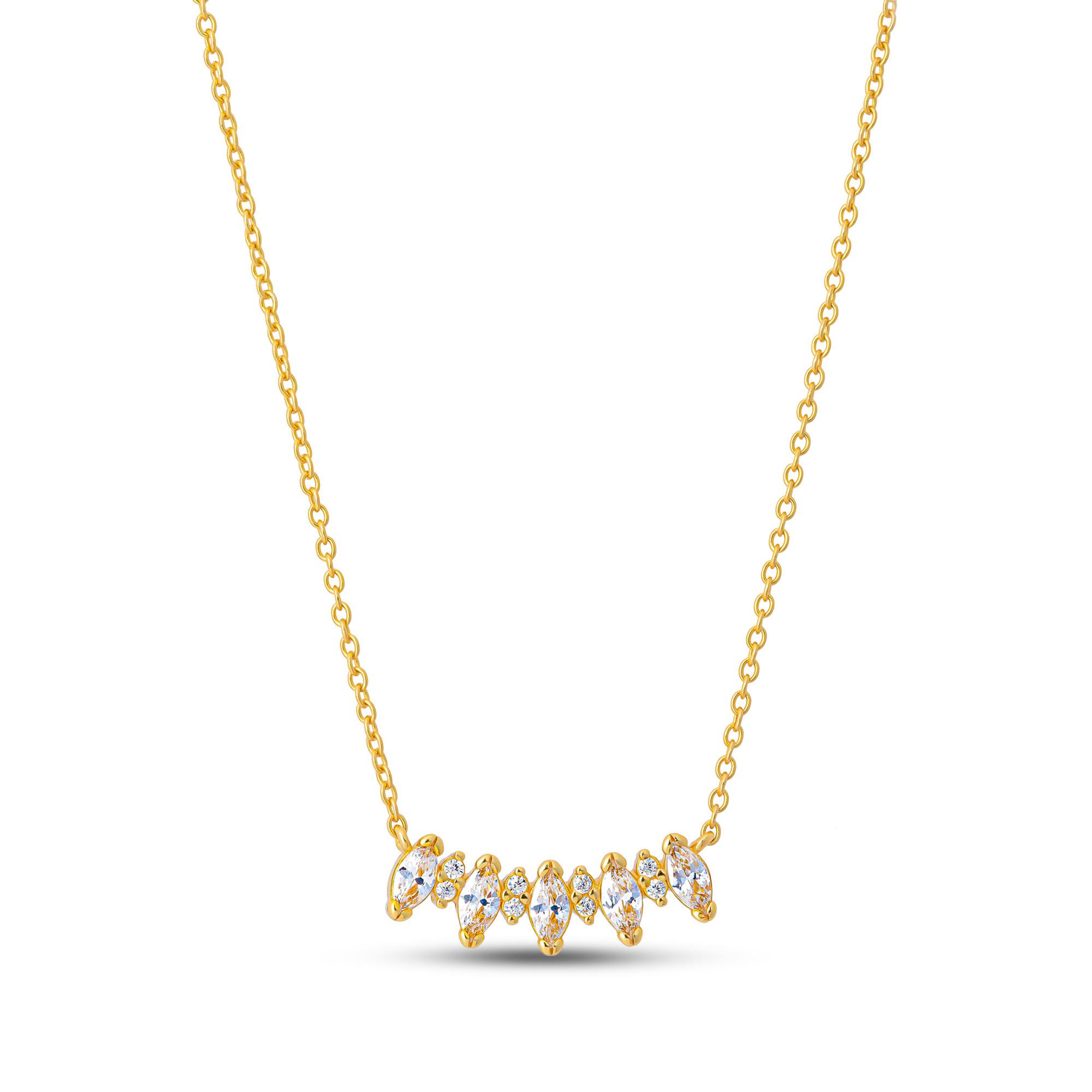Questo collier firmato L'Atelier Sterling Silver 925 è realizzato in argento puro dorato. Il gioiello racchiude pietre ornamentali con incastonatura a griffe. L'elegante catena è regolabile in lunghezza e si chiude saldamente con un moschettone.