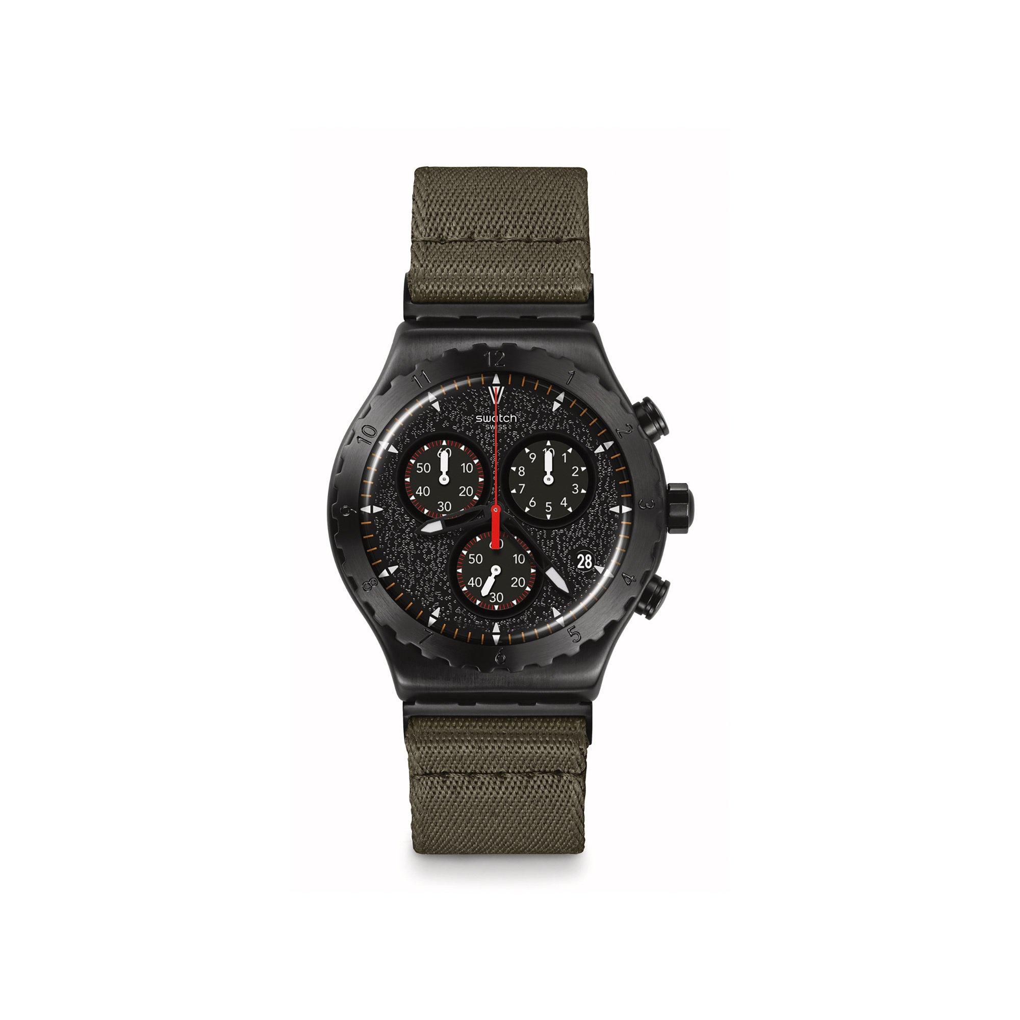 Questo cronografo in acciaio inossidabile ha un quadrante nero con innovativi dettagli 3D, stampa bianca e rossa e indici e lancette fluorescenti. La lunetta e la cassa sono in acciaio inossidabile spazzolato con rivestimento in PVD nero. Un cinturino in tessuto verde kaki, passanti in acciaio inossidabile con rivestimento in PVD nero e mezza fibbia in acciaio inossidabile completano il modello.