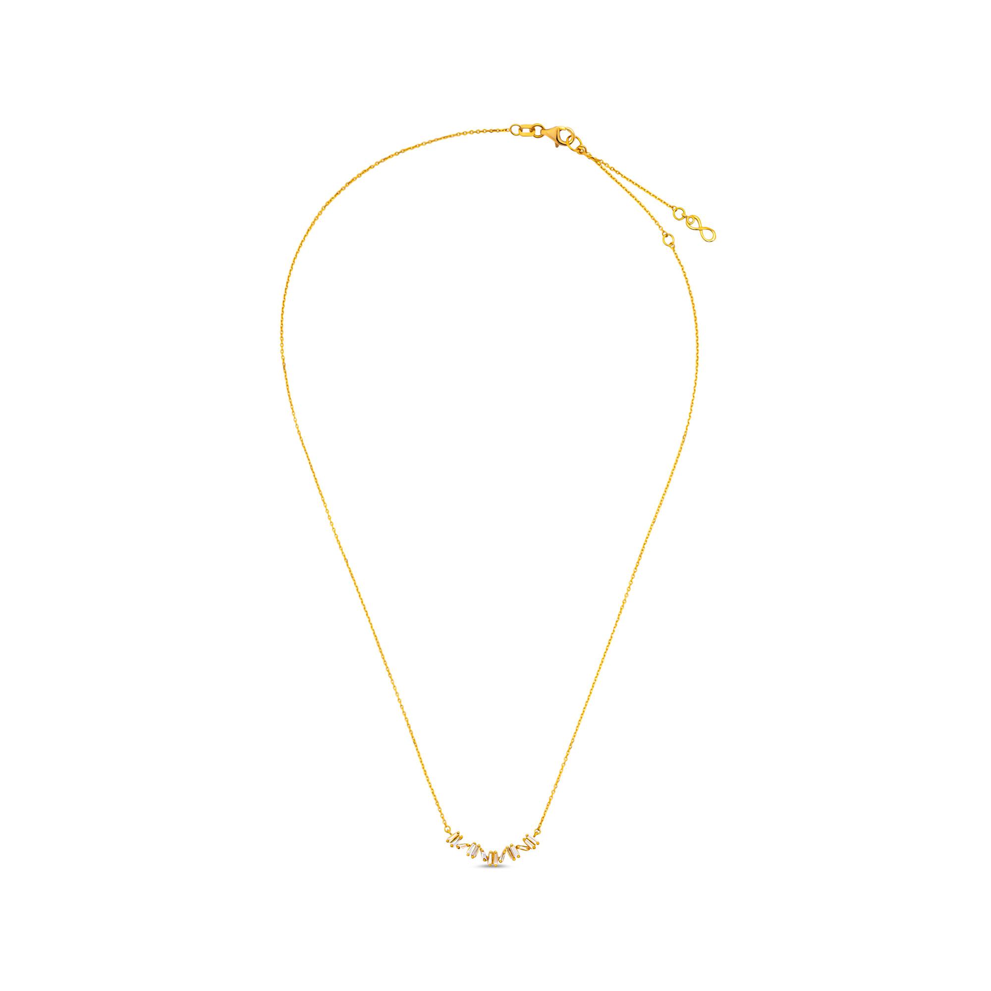 Questa delicata collana firmata Zen Diamond è realizzata in oro giallo 750 e combina materiali di alta qualità con un design raffinato. Il pezzo centrale è composto da 14 brillanti allungati e incastonati con un peso totale di 1,37 carati, che formano un motivo originale. La disposizione giocosa delle pietre dona al gioiello un aspetto vivace ed elegante.