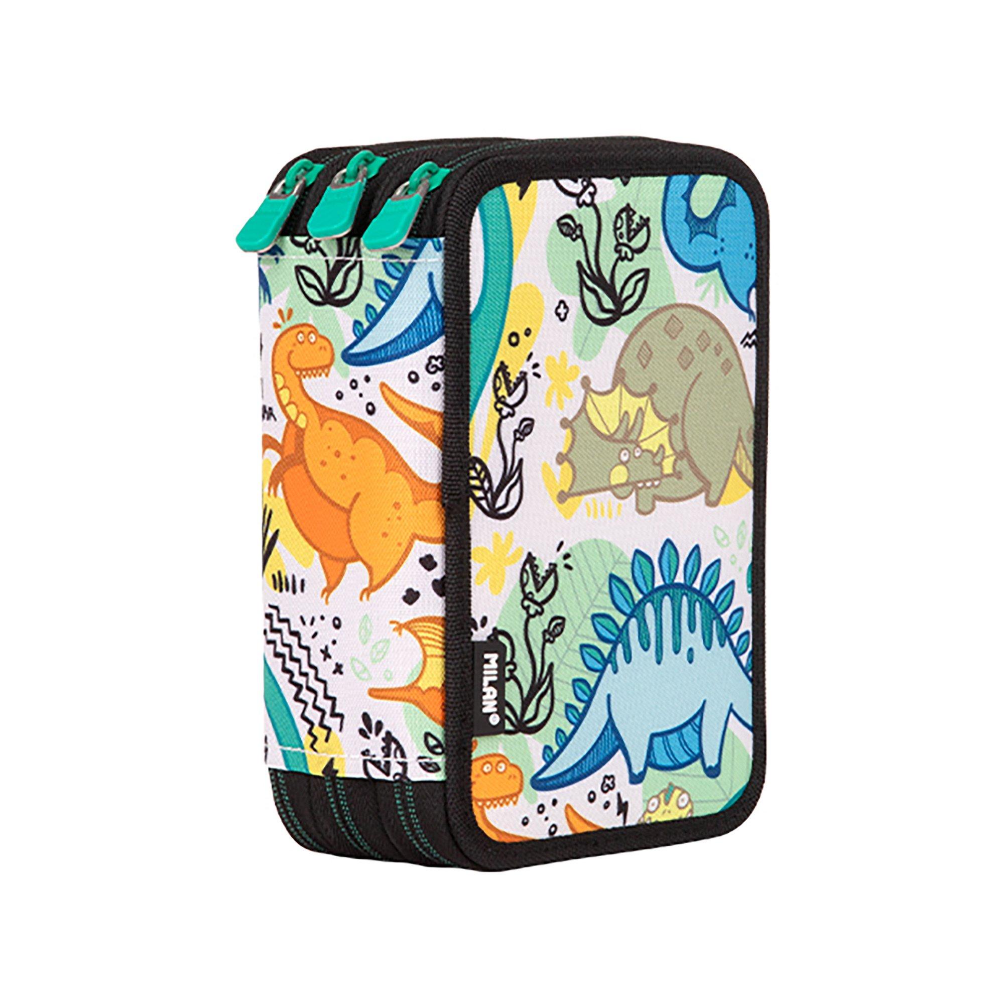 Un astuccio per matite a tre livelli, ideale per tenere in ordine e facilmente accessibile il materiale scolastico. Serie speciale Dinos, una collezione con simpatici dinosauri che vivono tra foglie colorate e piante carnivore. Stampato in colori vivaci: verde, blu, arancione e giallo su tessuto bianco. Zip e dettagli in nero. Una collezione con la tavolozza di colori The Fun e forme colorate. Il contenuto comprende: 1 gomma 4024, 1 temperamatite AFILA, 1 matita di grafite esagonale HB, 3 matite P1 (blu, nera e rossa), 1 righello triangolare da 15 cm, 12 matite colorate triangolari, 6 matite colorate in legno nero metallizzato, 5 fineliner pastello Sway, 1 paio di forbici Basic e 18 pennarelli da colorare a punta conica.