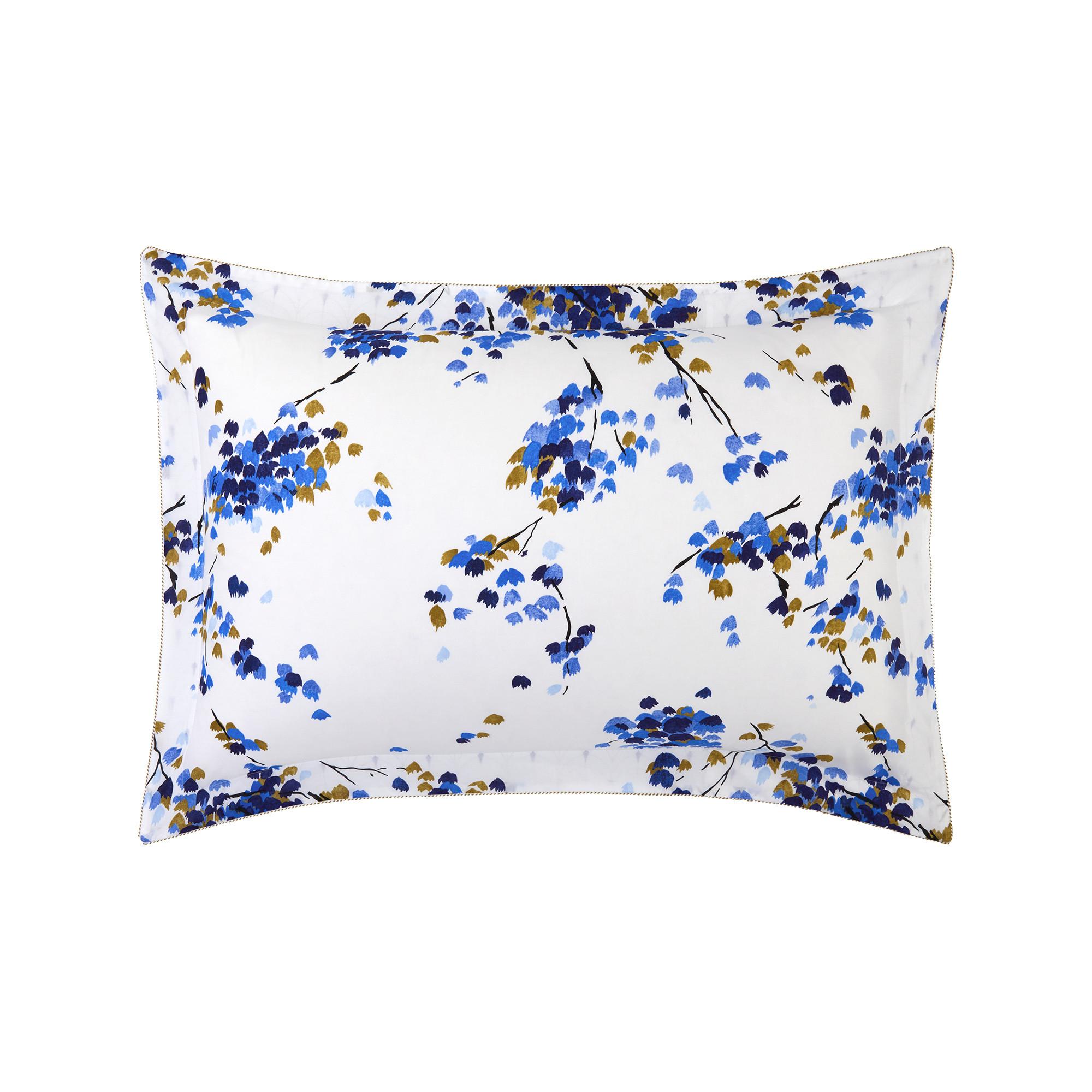Cercare l'ombra nei giardini. La vista del cielo attraverso il fogliame esposto ai raggi del sole. Un disegno contemporaneo in blu Klein, stampato su batista di cotone. Federa reversibile con bordo intrecciato. Stampato su batista di cotone biologico al 100%.