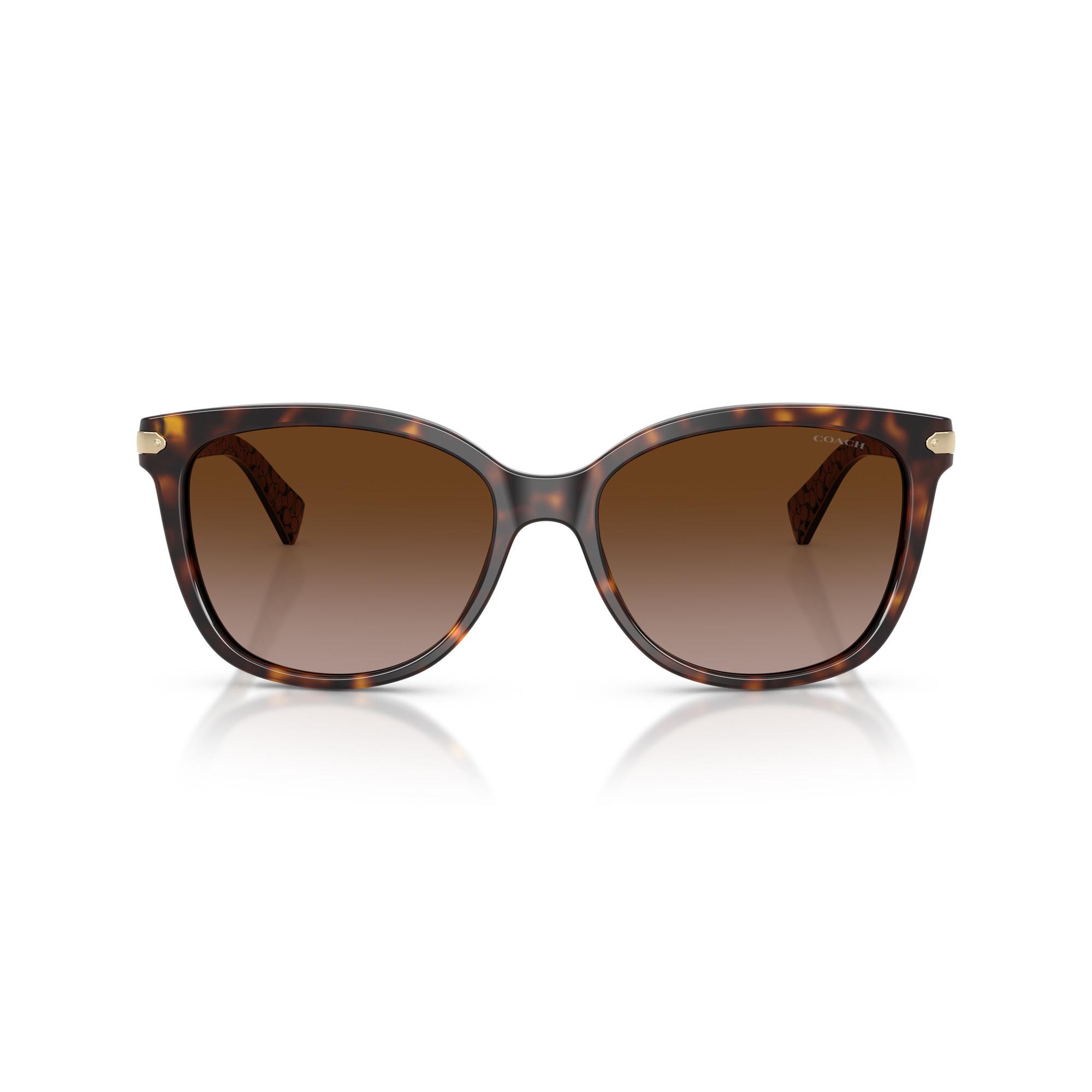 Questi occhiali da sole presentano una classica montatura quadrata con un sofisticato motivo tartarugato. Le lenti offrono una tinta sfumata, garantendo sia stile che protezione solare. Le aste sono adornate con l'iconico motivo del logo Coach, aggiungendo un tocco di lusso al design. Questi occhiali da sole sono un accessorio versatile che si abbina a diverse forme del viso e outfit.