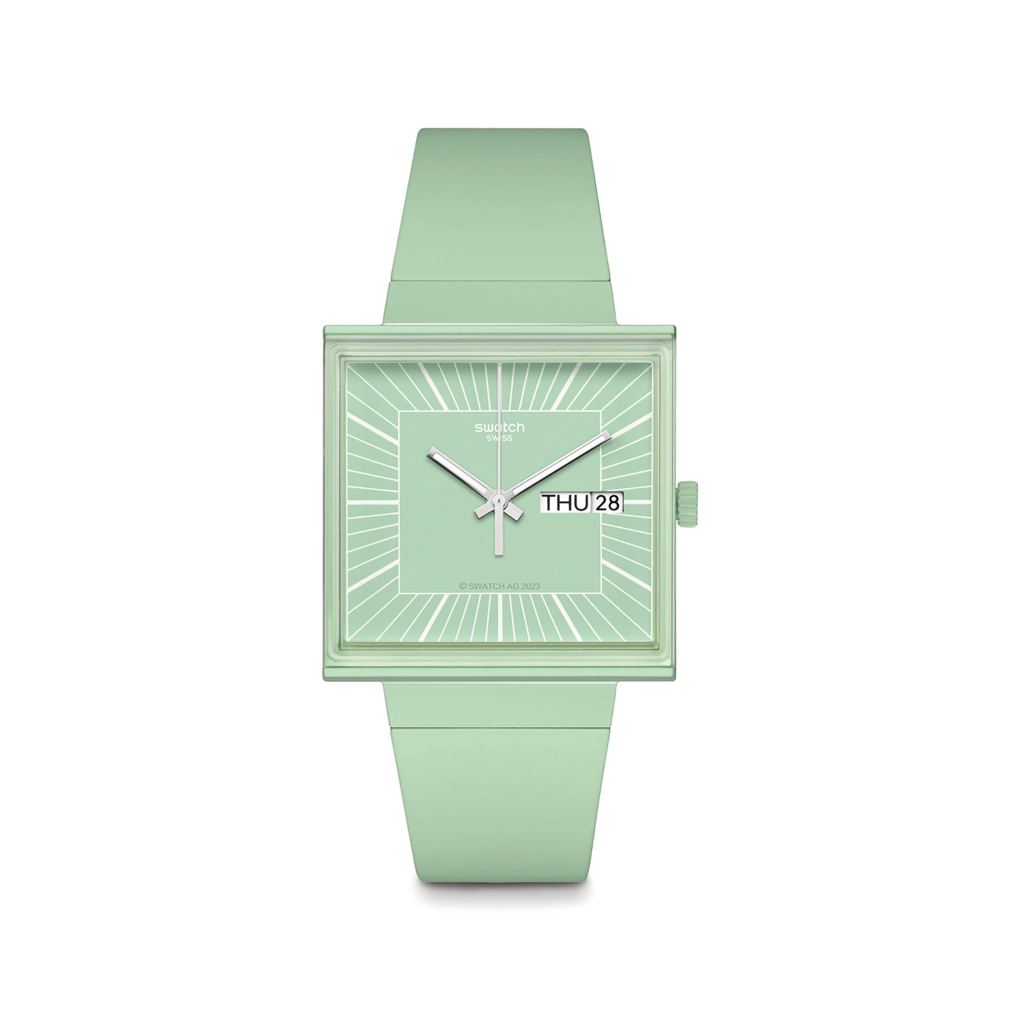 La cassa quadrata BIOCERAMIC color menta ha un vetro per orologio a base biologica che mostra gli indici dell'orologio stampati in bianco sul lato. Il quadrante quadrato è decorato con lancette fluorescenti argentate e un datario a ore 3. Il quadrante è completato dal bracciale a base biologica integrato con chiusura BIOCERAMIC. Il coperchio stampato della batteria sul retro mostra una vista frontale dell'orologio.