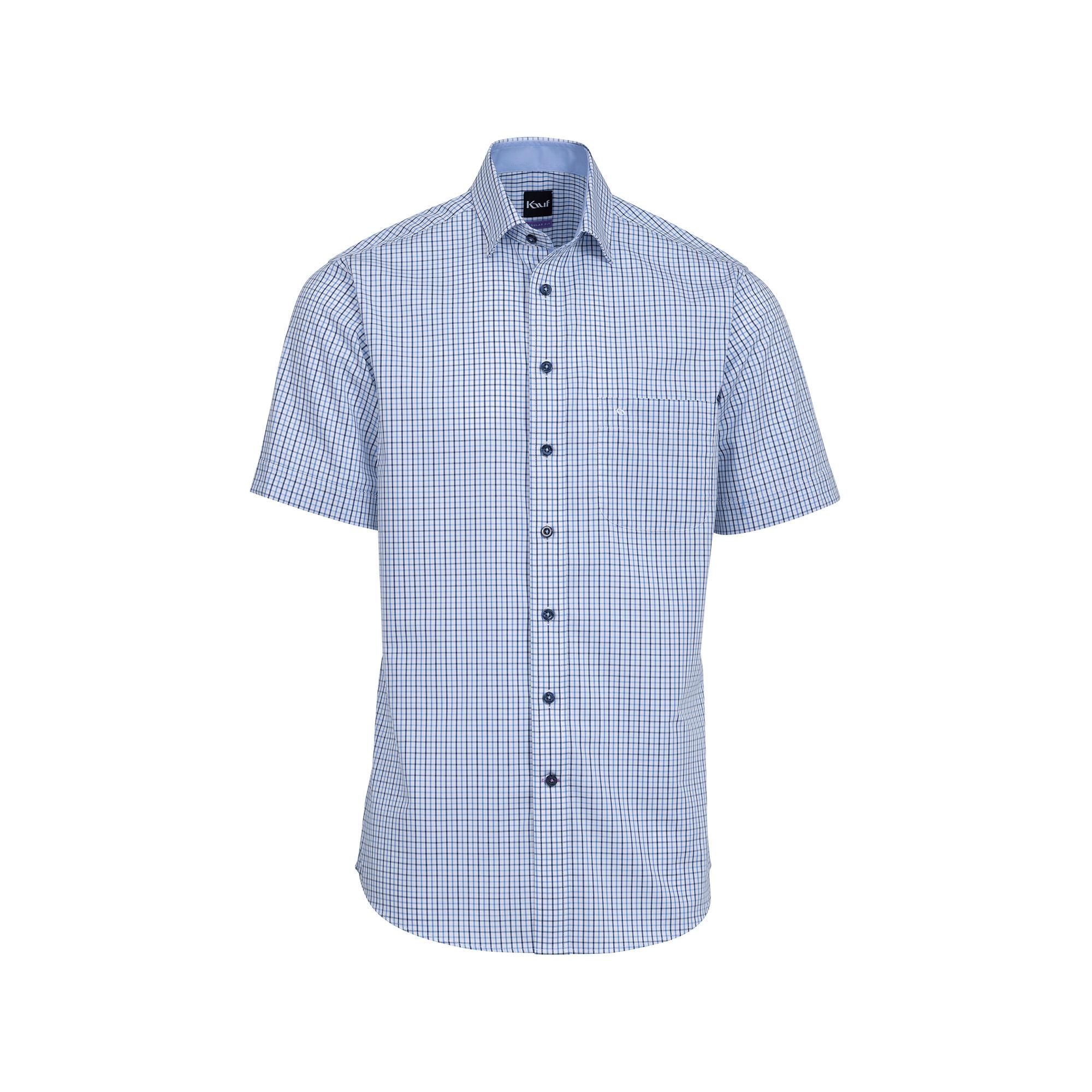 Questa camicia da ufficio a quadri firmata Kauf è realizzata in puro cotone e ha un taglio classico, un colletto alla francese, un taschino sul petto e un orlo arrotondato.