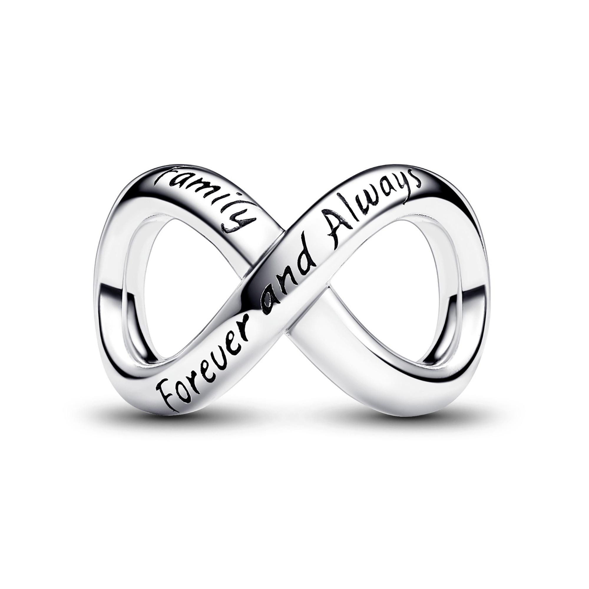"Tieni stretto il legame eterno con il nostro ciondolo per sempre e per sempre, un gioiello unico in argento sterling. Il ciondolo cattura l'essenza della famiglia e forma con grazia il simbolo dell'infinito, che riflette la natura senza tempo di queste amate connessioni. Questo ciondolo firmato Pandora è inciso con le parole ""Family"" e ""Forever and Always"" e cattura lo spirito duraturo della parentela. Lascia che ti ricordi che la famiglia è eterna e che la gioia che si trova nella comunità è illimitata. "
