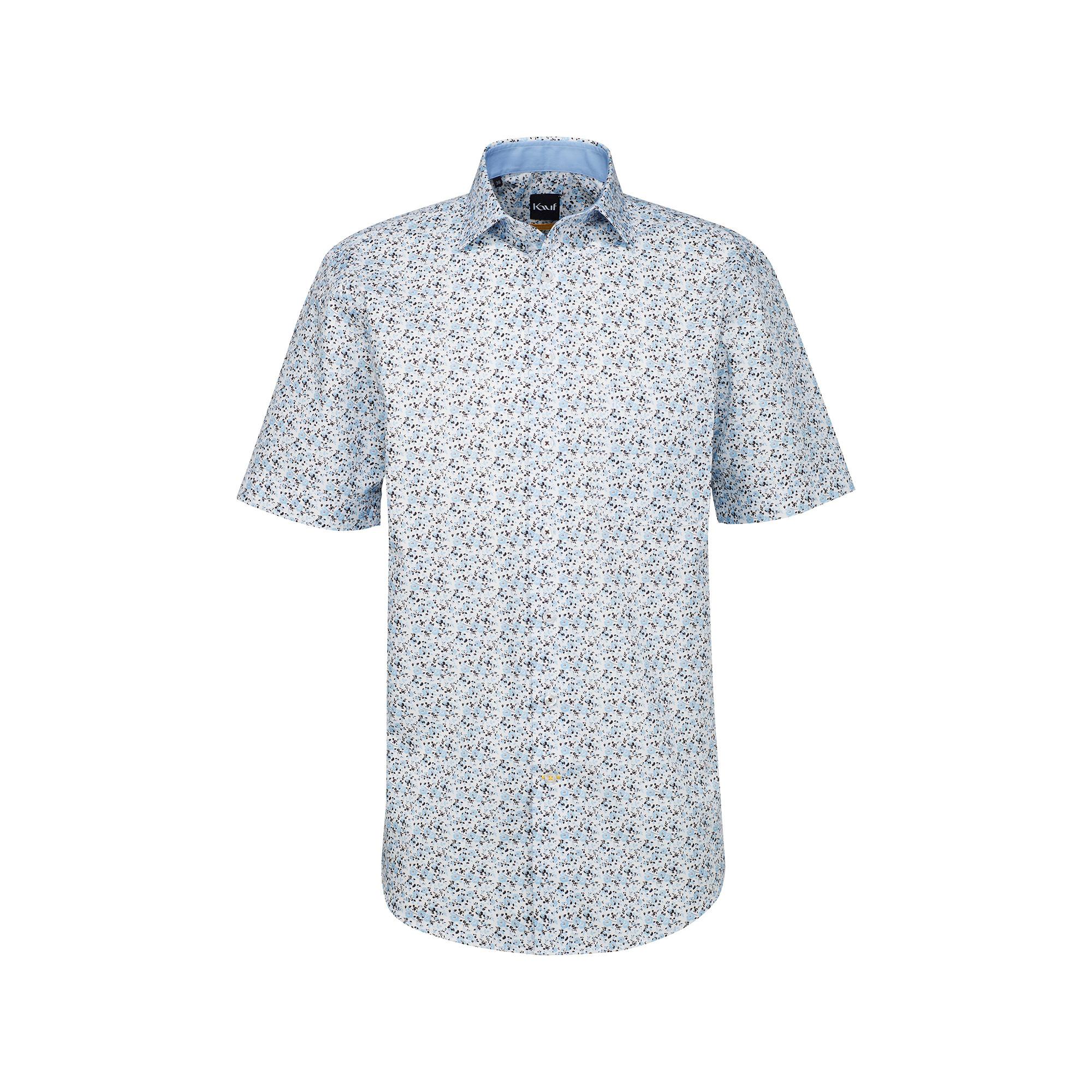 Questa camicia da uomo firmata Kauf è realizzata in puro cotone e propone una fantasia sobria, una vestibilità stretta e un classico colletto alla francese, un taschino sul petto e un orlo arrotondato.