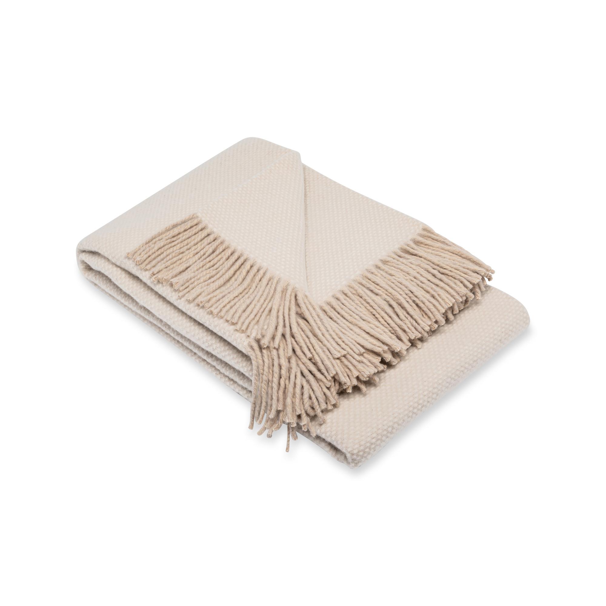 Questo plaid firmato Manor è tessuto in morbida fibra acrilica bicolore, con frange.