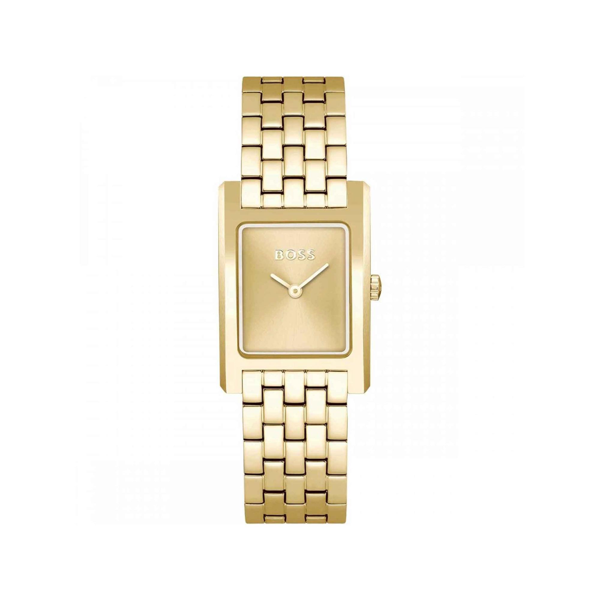 Elegante orologio BOSS. L'accessorio in acciaio inossidabile dorato è dotato di una cassa a serbatoio e di un quadrante tonale. Un bracciale a cinque maglie completa il design. Movimento: due lancette Colore del quadrante: giallo oro Materiale del cinturino: acciaio inossidabile Chiusura: fibbia con pulsante Resistenza all'acqua (in ATM): 3 ATM