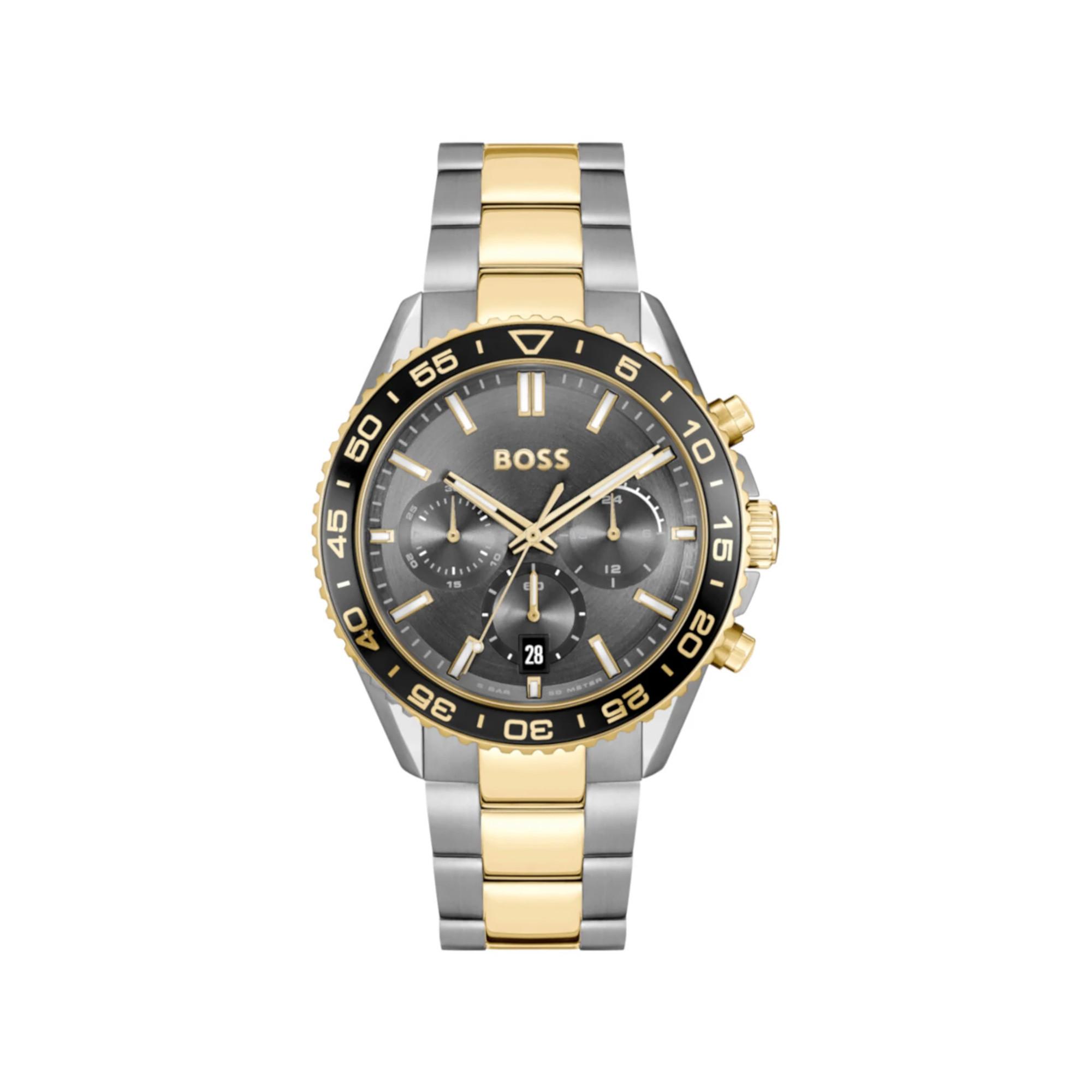 Elegante cronografo BOSS con quadrante grigio e lunetta rotante. L'accessorio particolare si chiude con un braccialetto a maglie argentate e dorate. Movimento: cronografo Materiale cinturino: acciaio inossidabile Chiusura: fibbia con pulsante Dimensioni della cassa: 43 mm Resistenza all'acqua (in ATM): 5 ATM