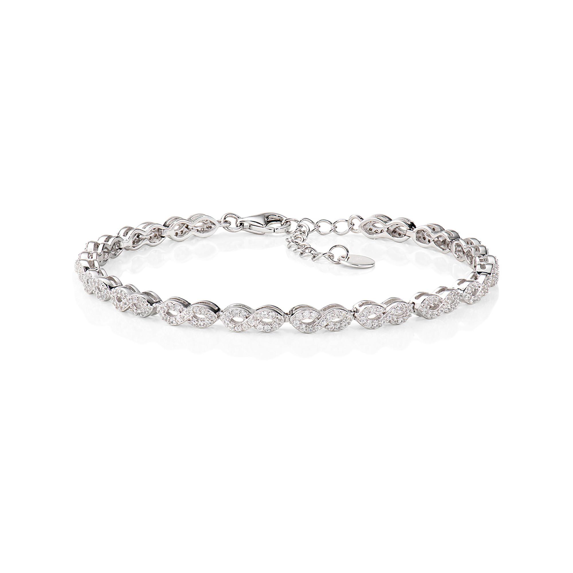 Il bracciale Love firmato Amen è realizzato in argento sterling rodiato ed è impreziosito da zirconi bianchi. Ha una lunghezza di 16 + 3 cm e una larghezza di 3 mm, ideale per un look elegante.