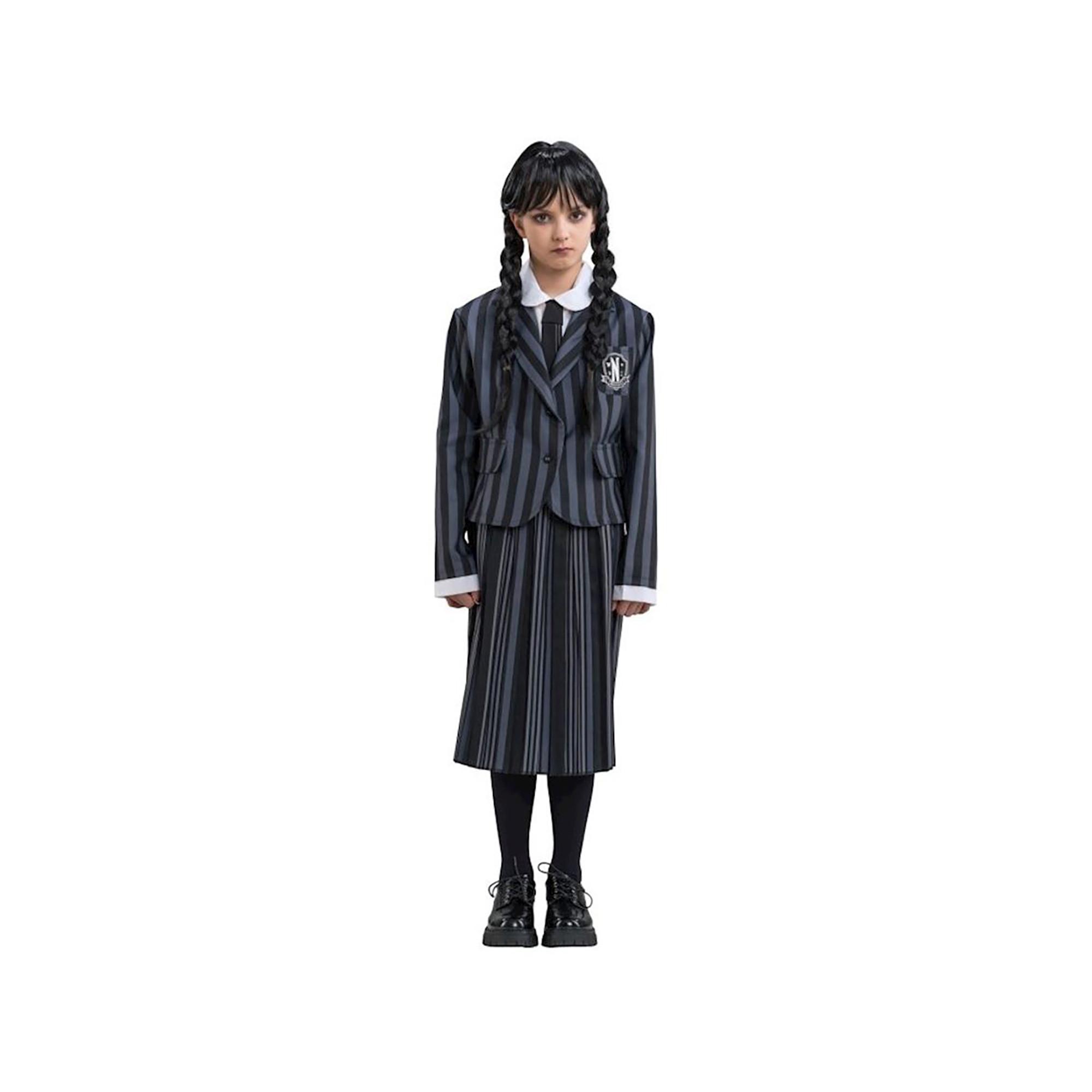 La giacca a righe nere e grigie con l'emblema della Nevermore Academy sul taschino è inclusa. È inclusa anche la gonna a pieghe a righe con una comoda fascia elastica in vita. L'inserto di camicia bianca con cravatta nera completa il costume da mercoledì per bambini.