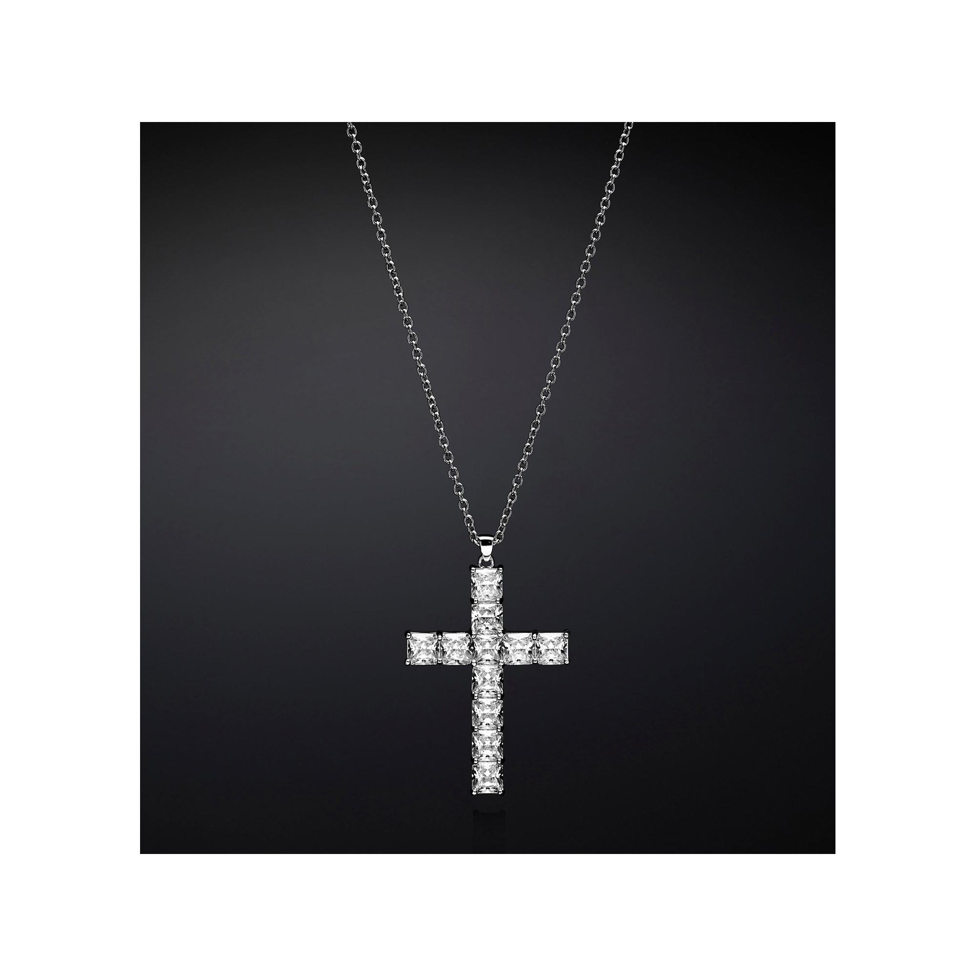 Collana con ciondolo in materiale placcato argento con zirconi bianchi quadrati a forma di croce. Croce: 5x3 cm, zirconi: 6x6 mm, catena: 60+5 cm.