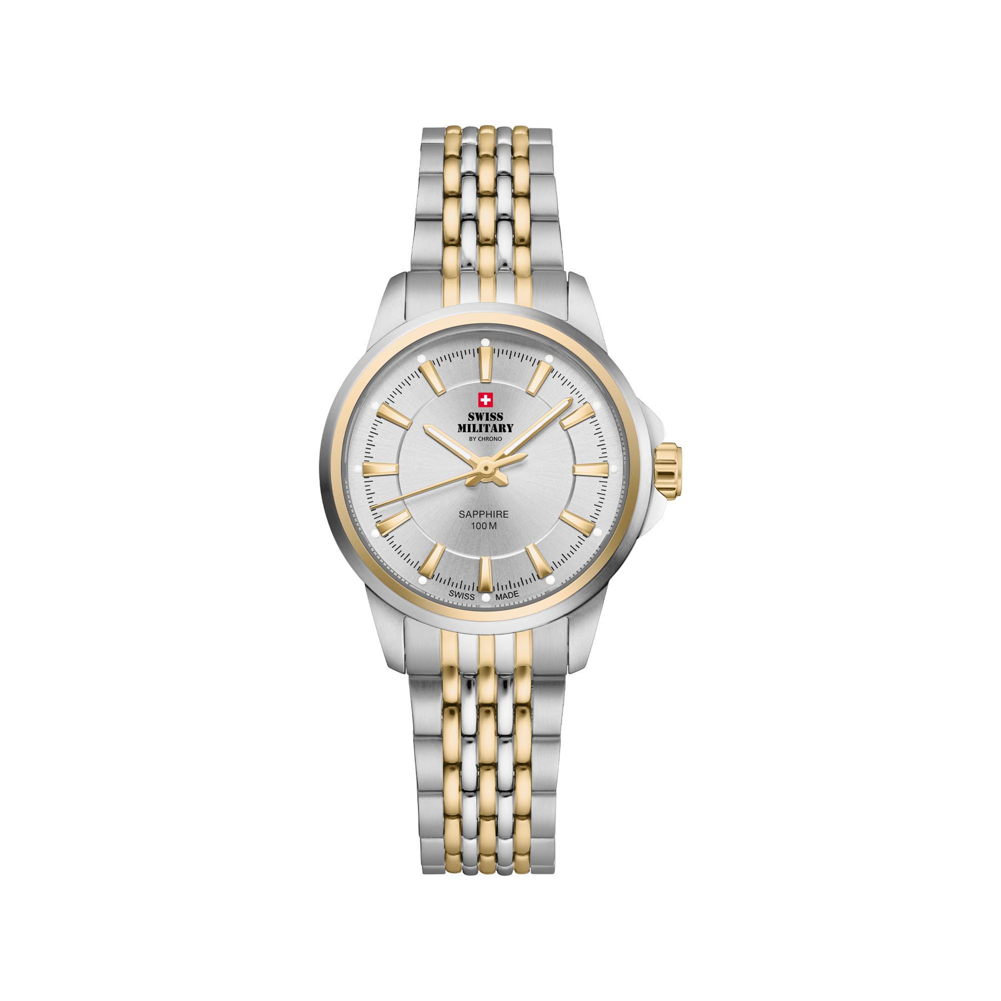 Questo orologio da donna intramontabile non � solo alla moda, � anche un accessorio affidabile ed elegante per ogni momento. L'elegante design bicolore presenta un quadrante argentato con indici e lancette classici. Inoltre, questo tradizionale orologio da donna � dotato di tutte le nostre caratteristiche di qualit� Swiss-made: Produzione interna svizzera Cassa e cinturino in acciaio inossidabile Vetro zaffiro Impermeabilit� fino a 100M/10ATM Movimento al quarzo svizzero