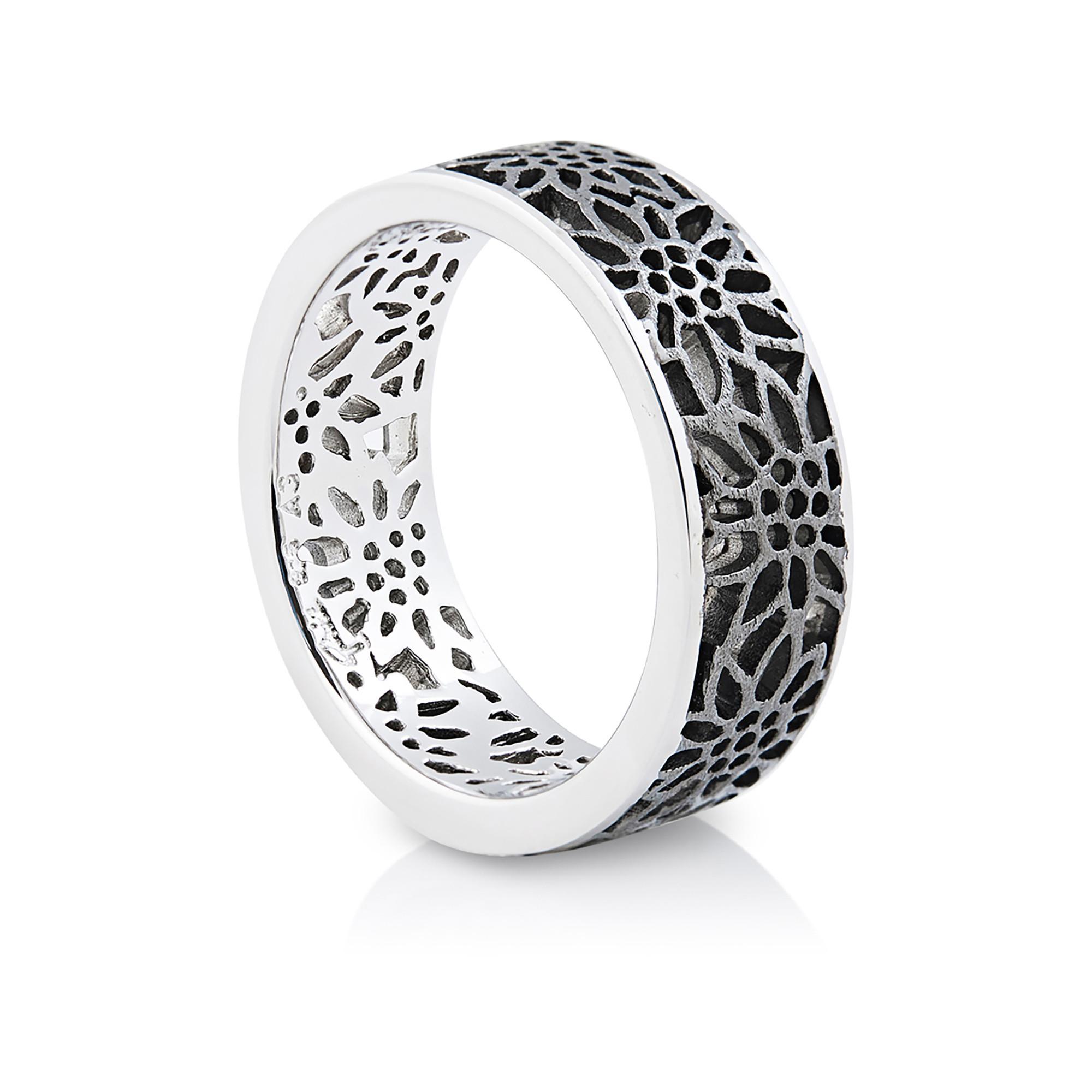 Anello raffinato in argento sterling con un design in filigrana di stelle alpine in nero. Questo anello simboleggia la cultura svizzera e i paesaggi alpini.