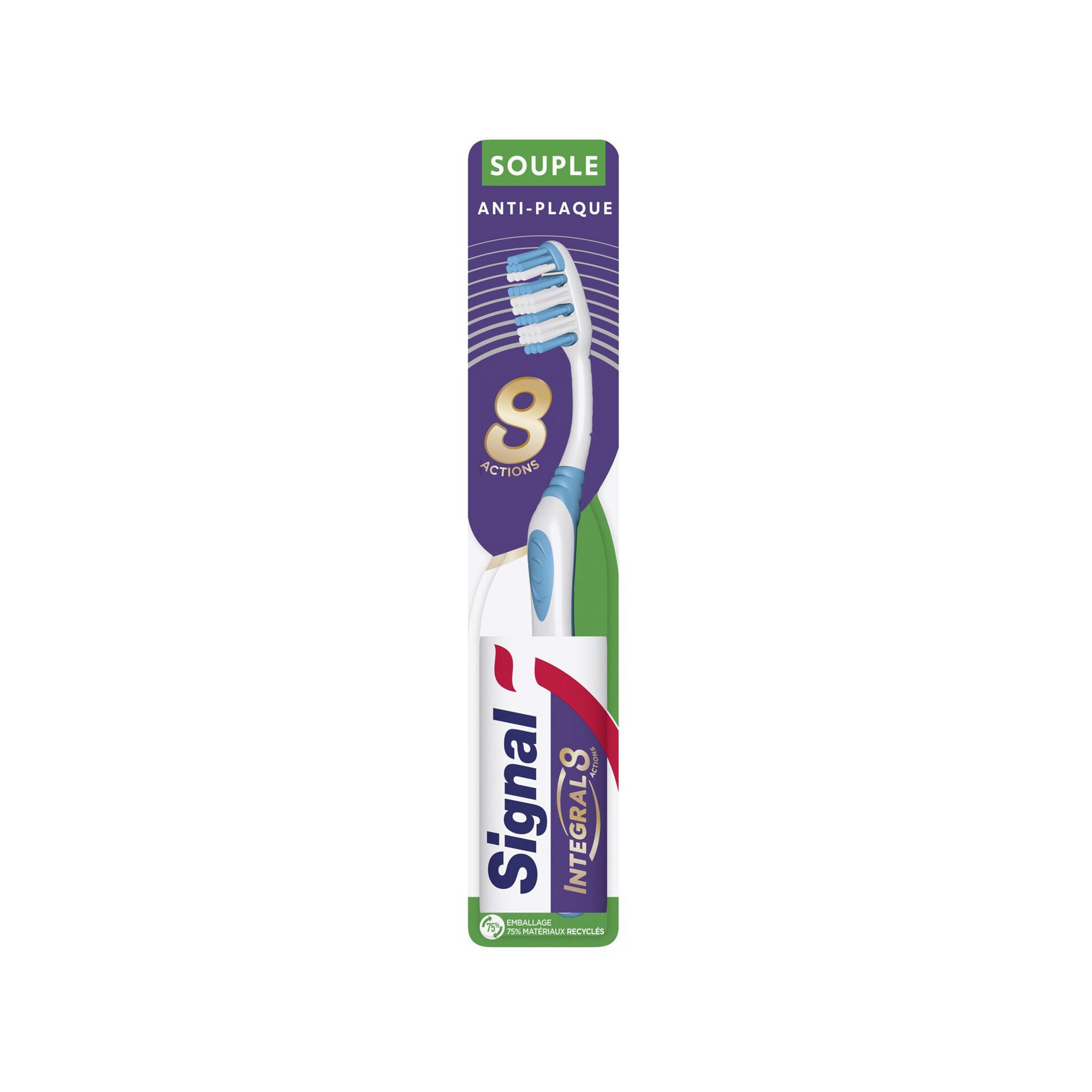 Lo spazzolino morbido Signal Soin Complet Integral 8 pulisce a fondo la bocca e aiuta a combattere la placca in modo più efficace. Ha 8 azioni: pulizia interdentale, rimozione della placca, aiuta a prevenire la carie, delicato sullo smalto, contro l'alito cattivo, accesso ai denti posteriori, spazzolino per guance e lingua e facile impugnatura. La sua azione antiplacca è provata al 100%. Ispirato agli strumenti utilizzati dai dentisti, la parte superiore del manico segue naturalmente la forma della mascella per una spazzolatura più precisa. Per completare la vostra routine di igiene orale, utilizzate questo spazzolino con il dentifricio Signal Complet Integral 8. Signal ha riprogettato la confezione dello spazzolino per ridurre l'impatto ambientale. La confezione di questo spazzolino è realizzata con il 75% di materiali riciclati. Lo spazzolino Signal Soin Complet è disponibile anche nella versione media o dura. Per una buona igiene orale per tutta la famiglia, seguite questi semplici passi: (1) al mattino, lavate i denti con il dentifricio e lo spazzolino Signal e sciacquate la bocca con il collutorio Signal. (2) Durante la giornata, rinfrescare l'alito con il collutorio Signal. (3) La sera, lavare i denti con lo spazzolino e il dentifricio Signal e risciacquare con il collutorio Signal. Ricordarsi di cambiare lo spazzolino ogni tre mesi e di recarsi regolarmente dal dentista.