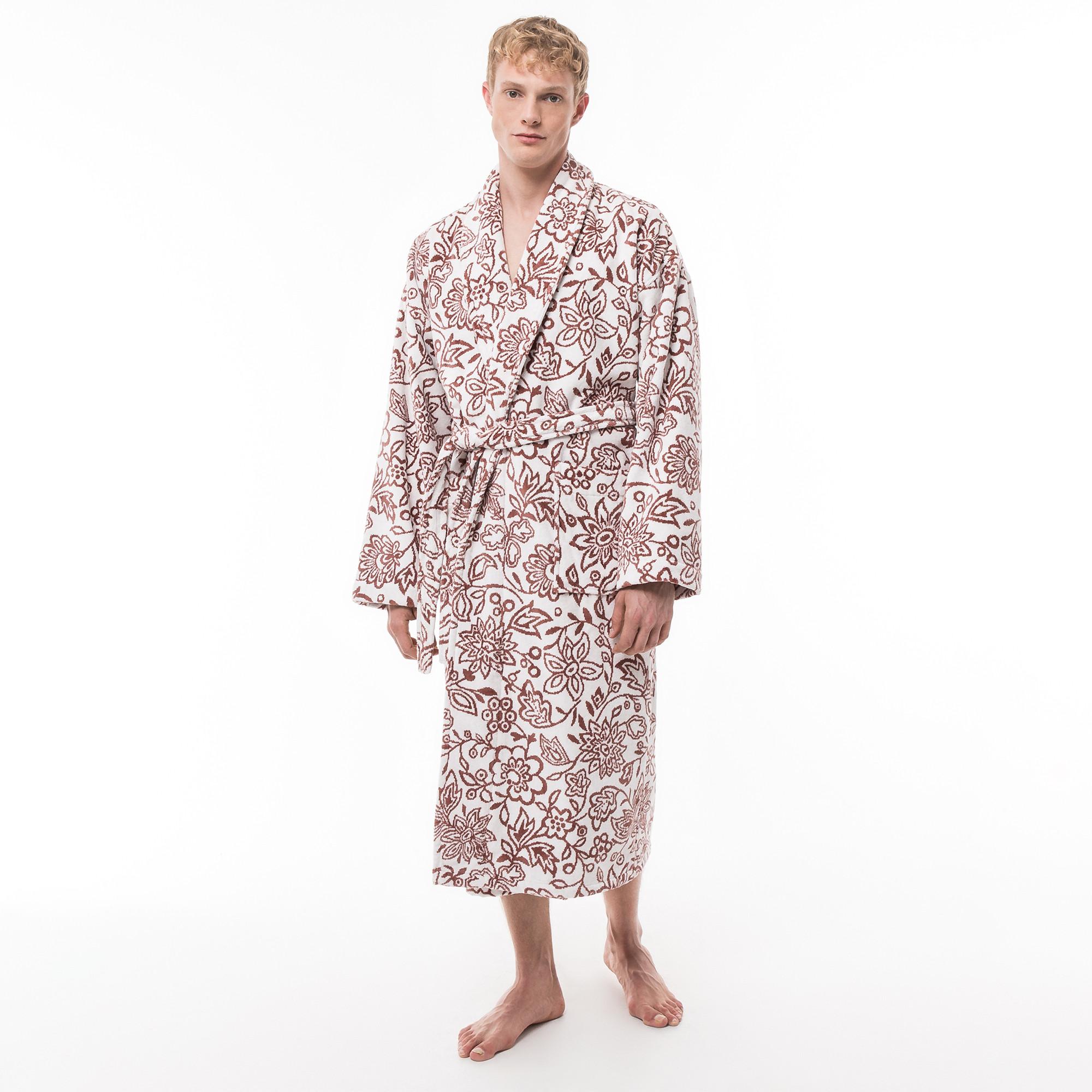 L'accappatoio Roma è realizzato in morbida spugna a trama fitta con un design floreale. La superficie in velluto dona una lucentezza vellutata. Ha un ampio collo a revers e passanti per la cintura in due altezze, in modo che la cintura da annodare si adatti correttamente. Anche le maniche larghe e le grandi tasche applicate ne fanno parte: per una pausa con la squisita sensazione di puro lusso.