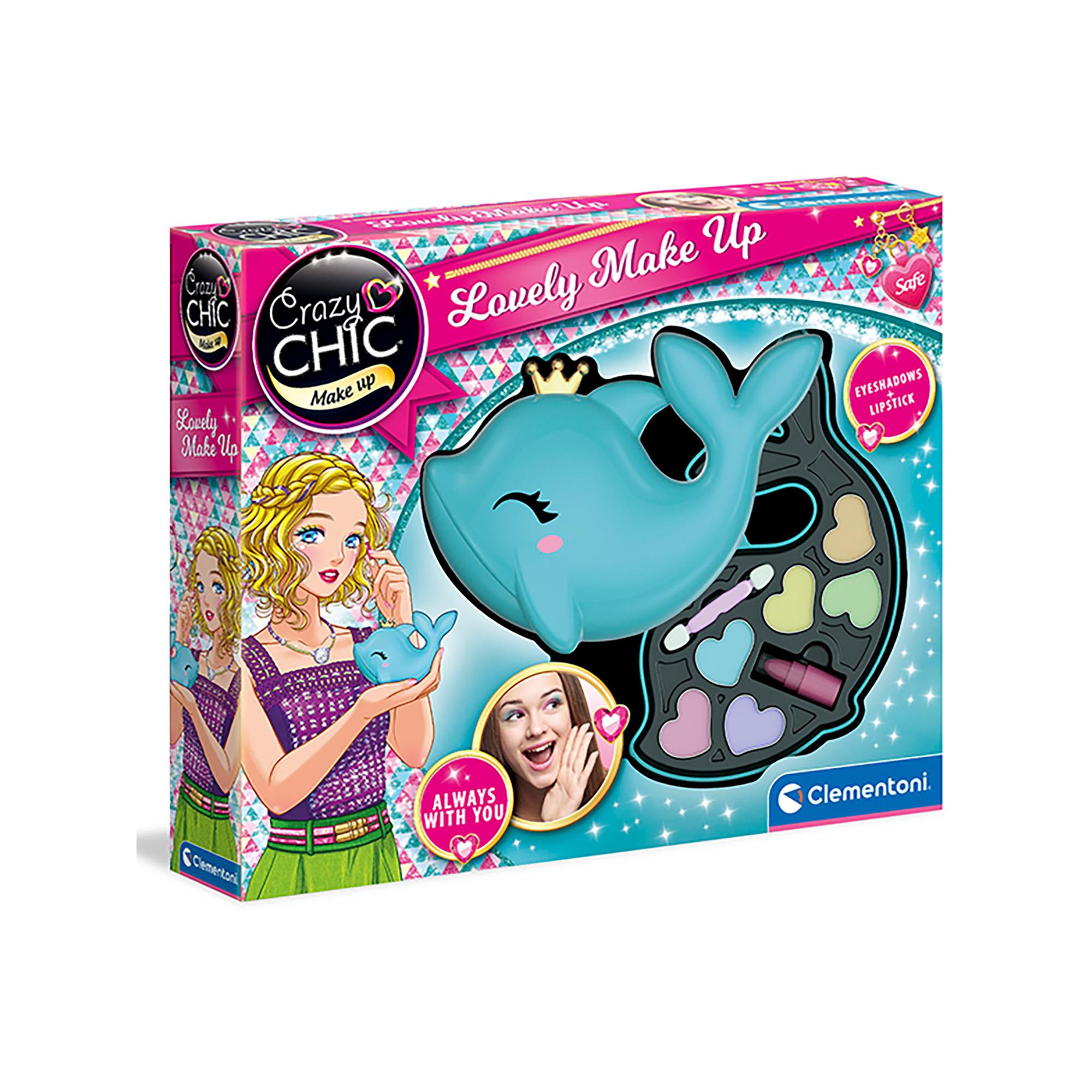 Crazy Chic Lovely Make Up Dauphin. Una palette trucco a forma di delfino da portare sempre con sé, con tonalità tenui per un look naturale e sempre di tendenza. Le bambine hanno sempre amato gli animali. Ecco perché Crazy Chic ha ideato delle splendide palette ispirate ai loro animali preferiti. La palette trucco è facile da trasportare, pronta a trasformare ogni momento in un momento creativo e divertente da condividere con le amiche ovunque. La palette contiene 6 ombretti, 1 rossetto e un applicatore per creare meravigliosi make-up. I trucchi sono stati testati per garantire la massima sicurezza. Le bambine possono divertirsi seguendo i tutorial online o i consigli delle amiche o delle mamme. Il delfino indossa una graziosa corona dorata. Palette ideali da collezionare, con un design prezioso e accattivante.