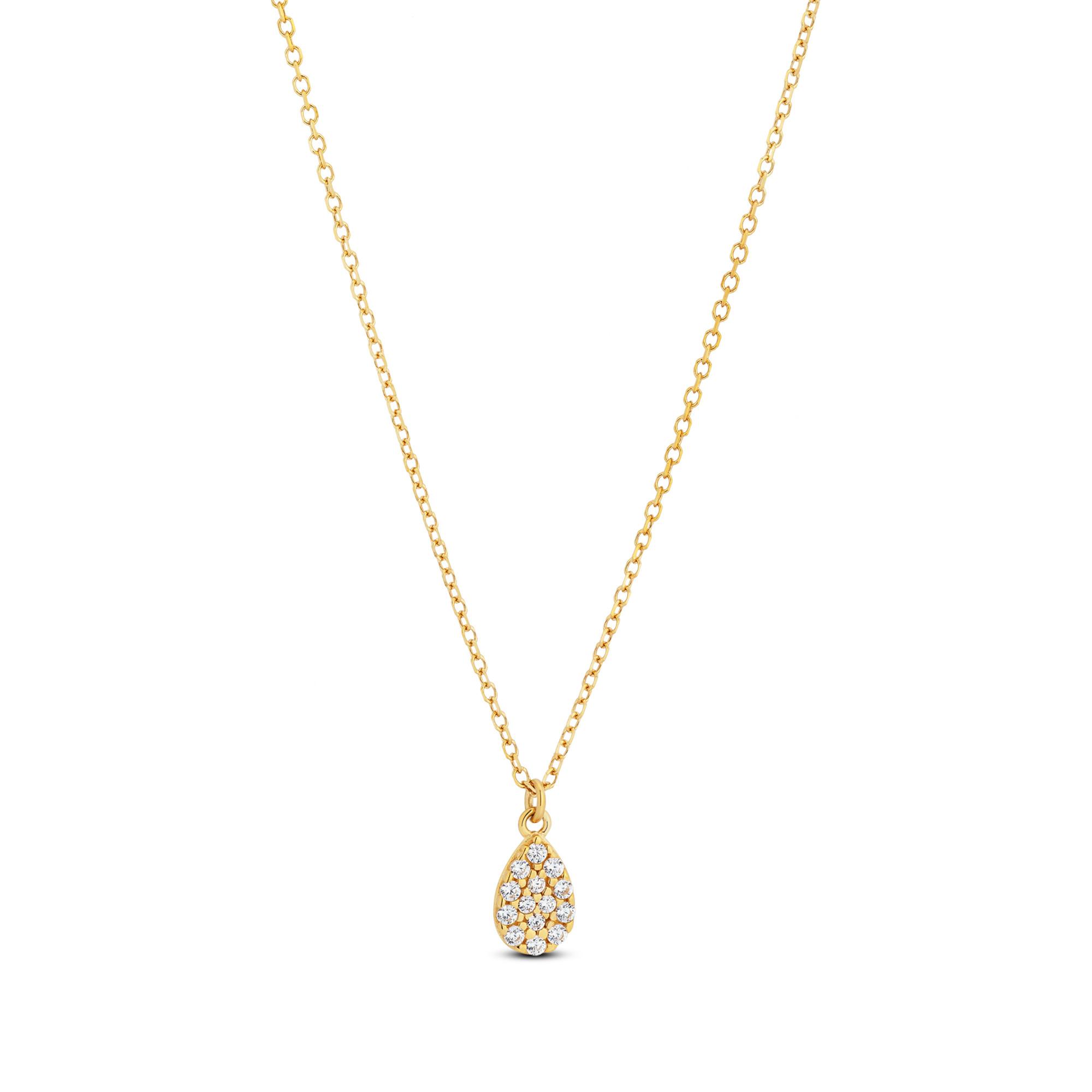 Questo collier firmato L'Atelier Gold 18 Karat by Manor è composto da una sottile catena in oro giallo 18 carati e da un ciondolo a goccia incastonato con zirconi. La catena si chiude con un anello a molla.