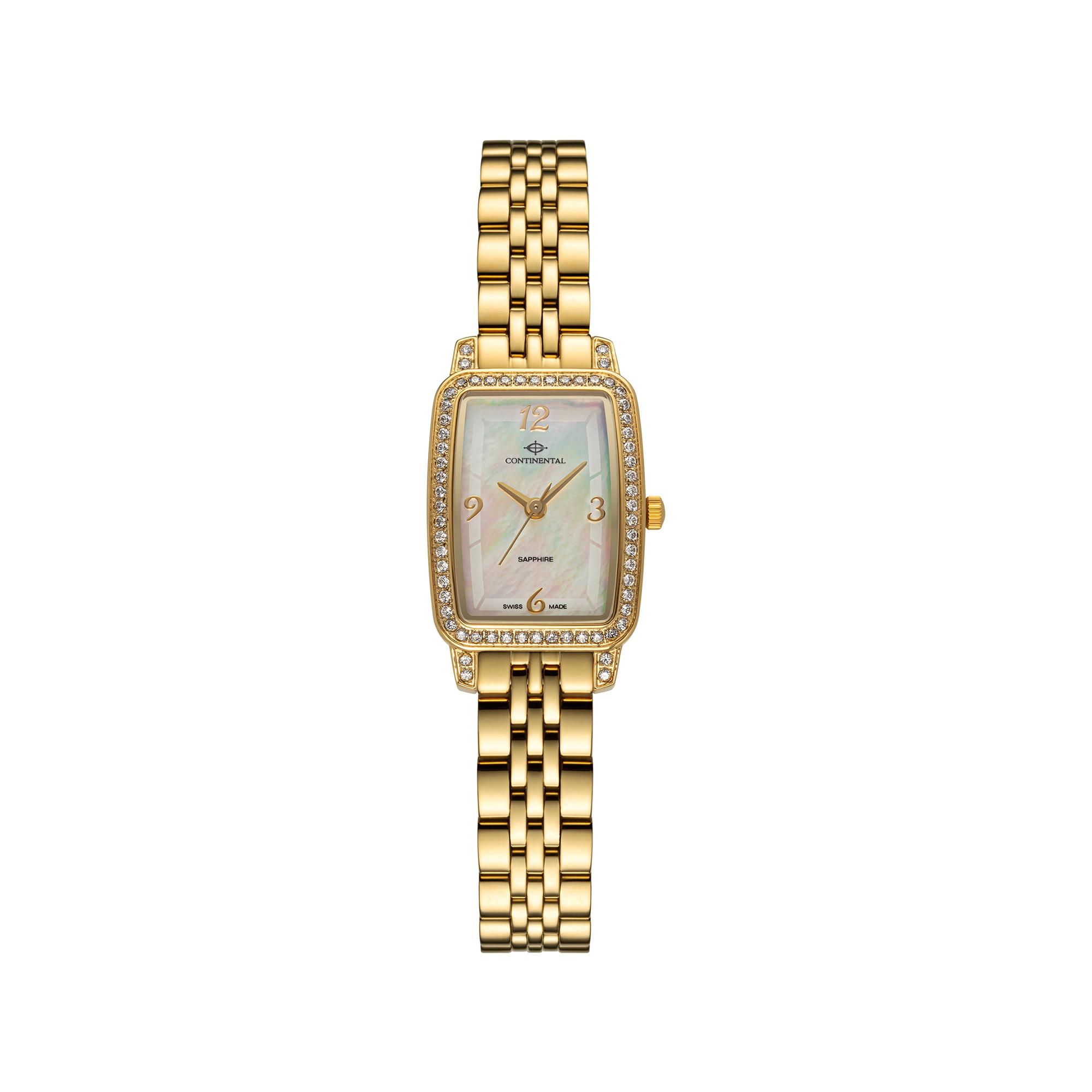 Questo elegante orologio da polso da donna firmato Continental della collezione di tendenza colpisce per la cassa rettangolare in acciaio inossidabile rivestito in PVD in oro giallo, decorata con cristalli Swarovski e un quadrante in madreperla. Ha un bracciale in metallo in oro giallo, un vetro zaffiro e un movimento al quarzo svizzero e offre una resistenza all'acqua fino a 30 metri.