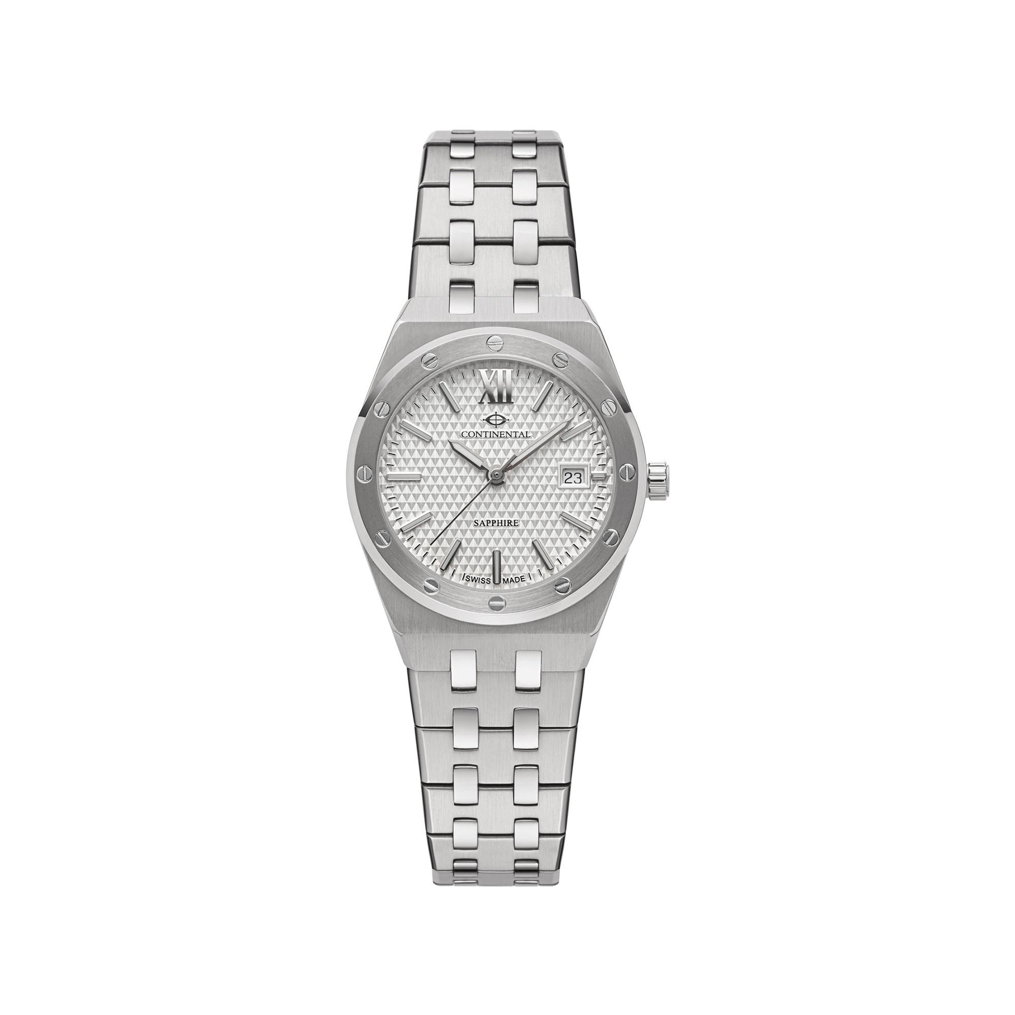 Questo orologio è disponibile nelle versioni da donna e da uomo e presenta una cassa in acciaio inossidabile con un diametro di 30 mm, un cinturino in acciaio inossidabile, un quadrante argentato e un vetro zaffiro. È impermeabile fino a 50 metri.