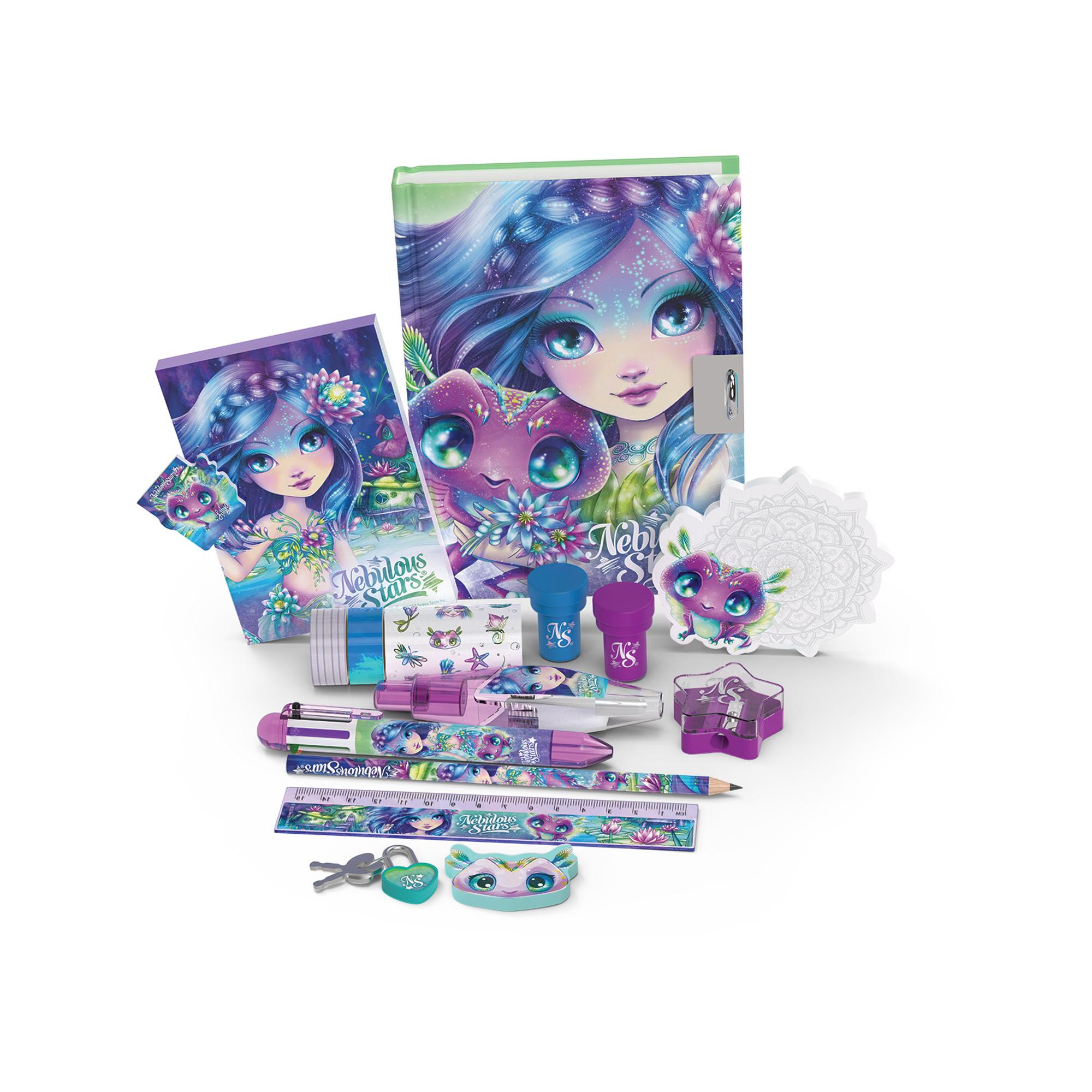 Questo è il kit perfetto per iniziare il tuo nuovo diario. Contiene tutto il necessario, tra cui una penna a 6 colori, un applicatore di motivi, un righello, una gomma, un nastro decorativo e, naturalmente, un lucchetto con chiave per custodire i tuoi segreti!