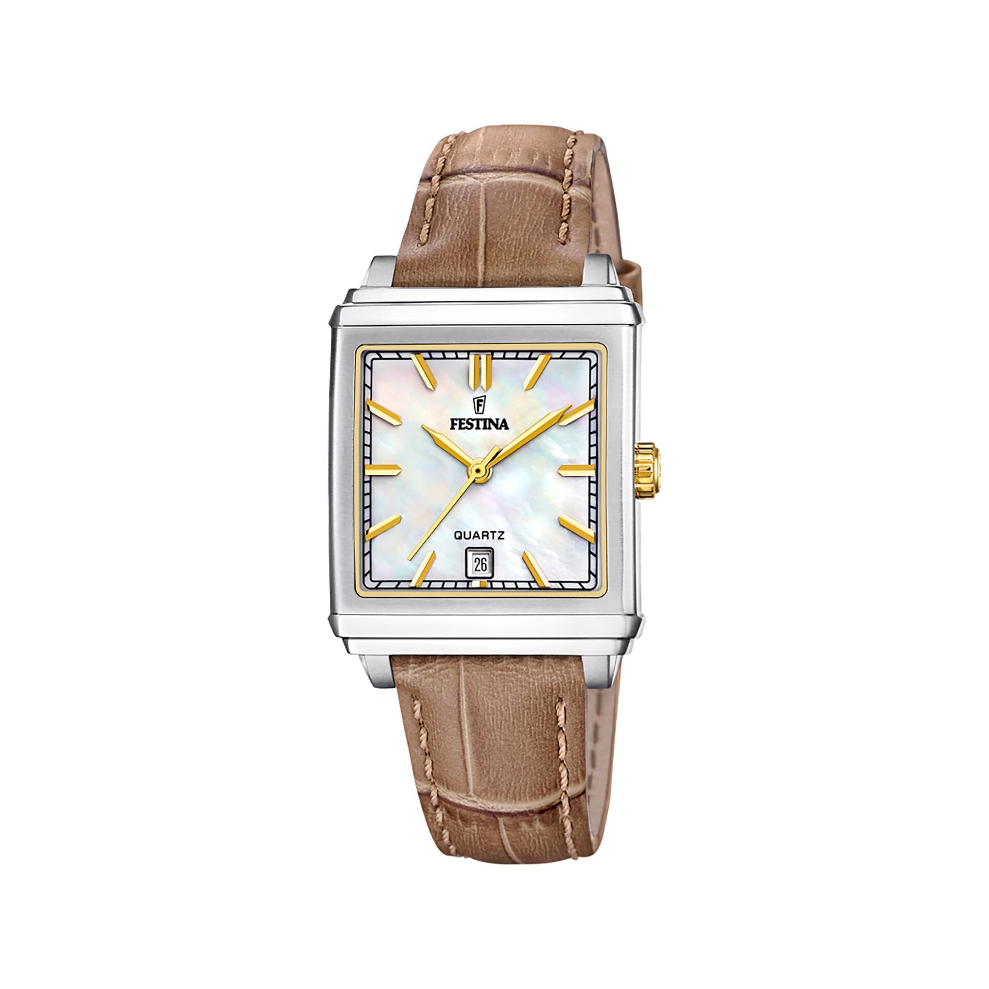 L'orologio da donna Festina ha una cassa rettangolare in acciaio inossidabile con un diametro di 27 mm e un vetro minerale. Il cinturino in pelle marrone è largo 17 mm ed è chiuso con una fibbia.