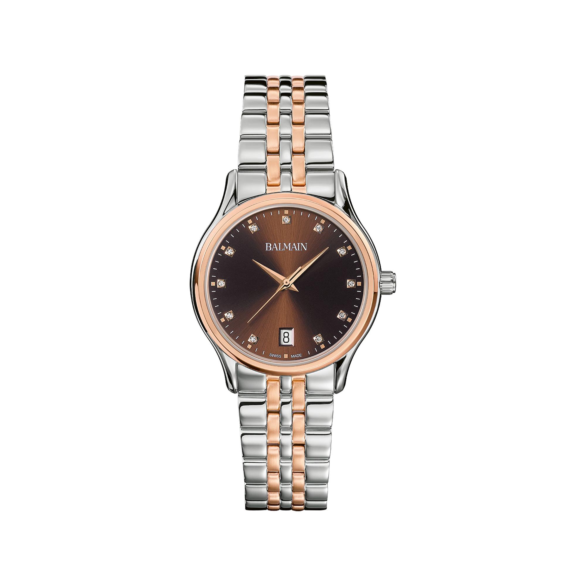Questo orologio da donna firmato Balmain ha una cassa rotonda in acciaio inossidabile con rivestimento in oro rosa PVD e un diametro di 32 mm. Dotato di un movimento al quarzo del tipo ETA F05.115, vetro zaffiro, un quadrante marrone decorato con 11 diamanti Top Wesselton VS-SI (per un totale di 0,041 carati) e un cinturino in acciaio inossidabile, l'orologio offre una resistenza all'acqua fino a 3 bar.