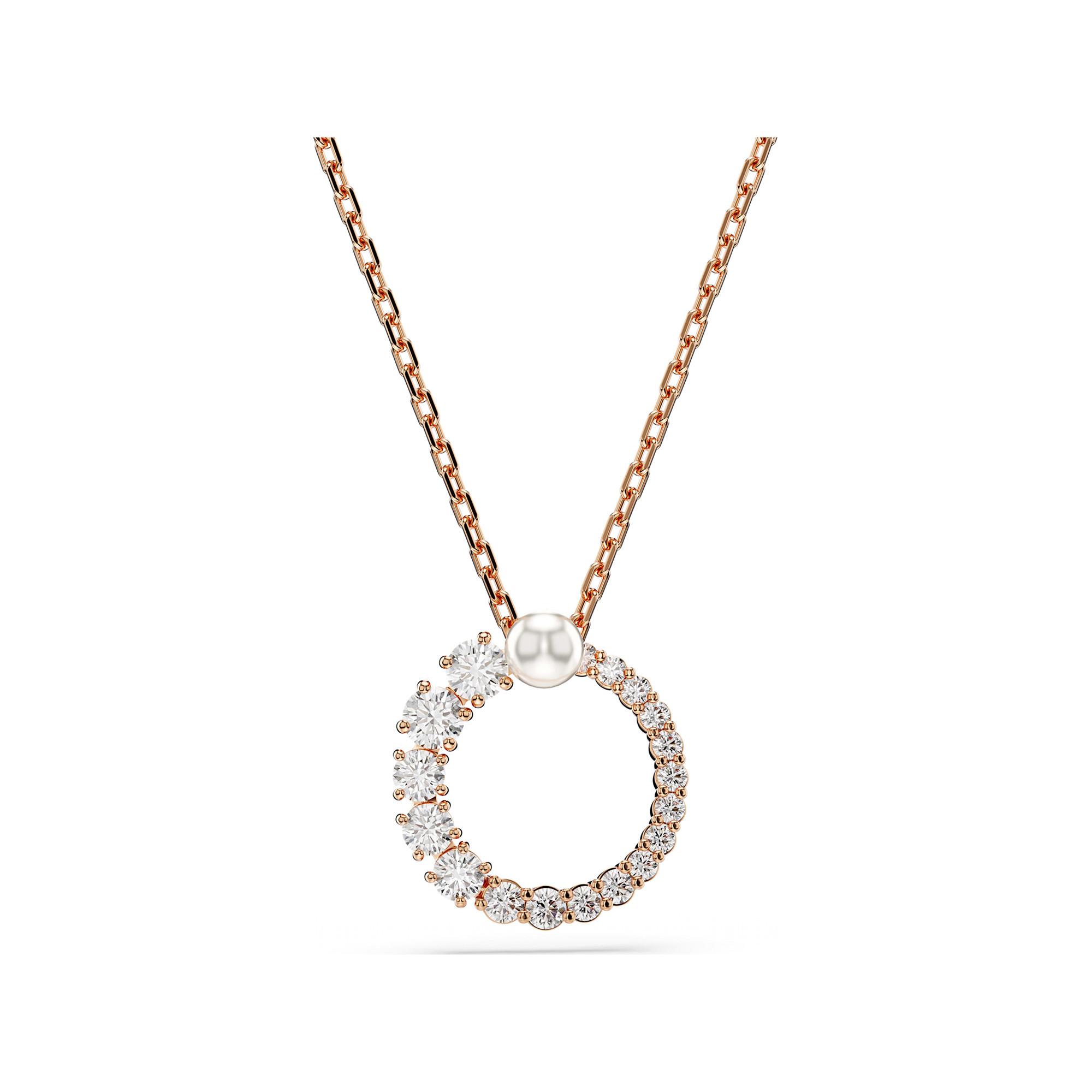 Le forme raffinate e i dettagli moderni di questo elegante ciondolo a matrice attirano l'attenzione. Il design in lega d'oro rosa con un cerchio in zirconi trasparenti in una forma senza cuciture e una perla di cristallo bianca centrale è appesa a una catena delicata. Per il massimo effetto, abbinate questa creazione con una mise in tinta unita.