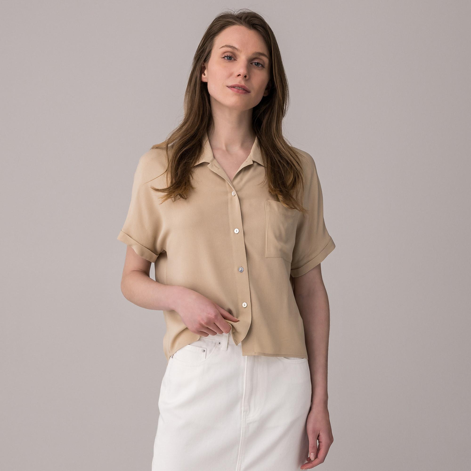 Questa camicetta è realizzata in viscosa leggera e ariosa, con un taglio rilassato, un colletto a revers e maniche corte arrotolate per una finitura elegante. La camicetta può essere abbinata in molti modi, rimanendo sempre sorprendentemente casual e soprattutto femminile.