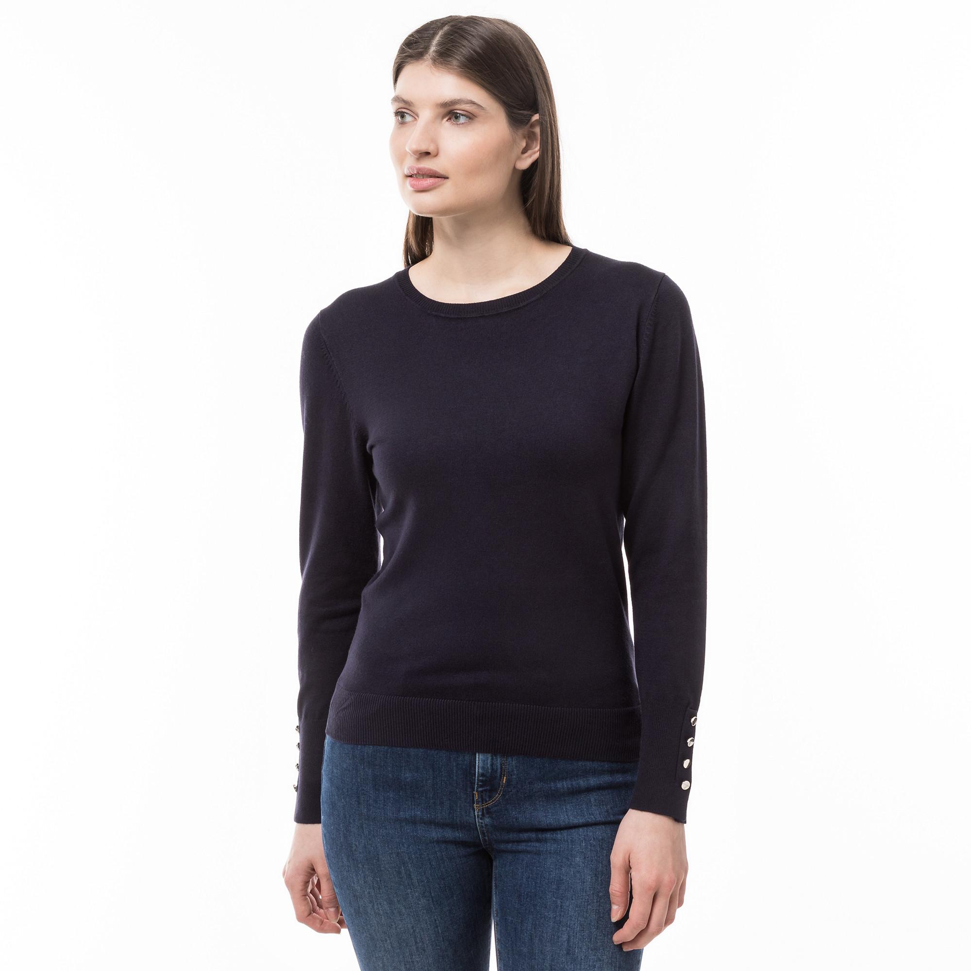 Questo maglione a maniche lunghe presenta un classico girocollo, offrendo un'aggiunta versatile a qualsiasi guardaroba. Il design include bottoni decorativi sui polsini, aggiungendo un tocco di eleganza al capo.
