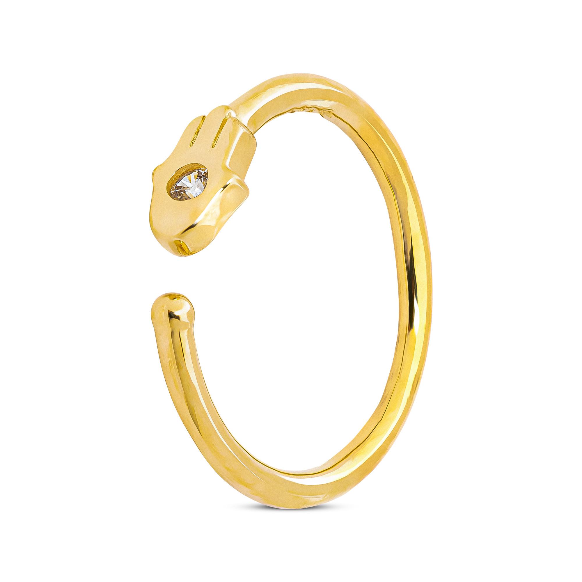 Questo piercing firmato Studio Marquise è un gioiello inconfondibilmente delicato in oro 18 carati. La parte finale del cerchio aperto rappresenta una mano di Fatima con uno zircone all'interno.