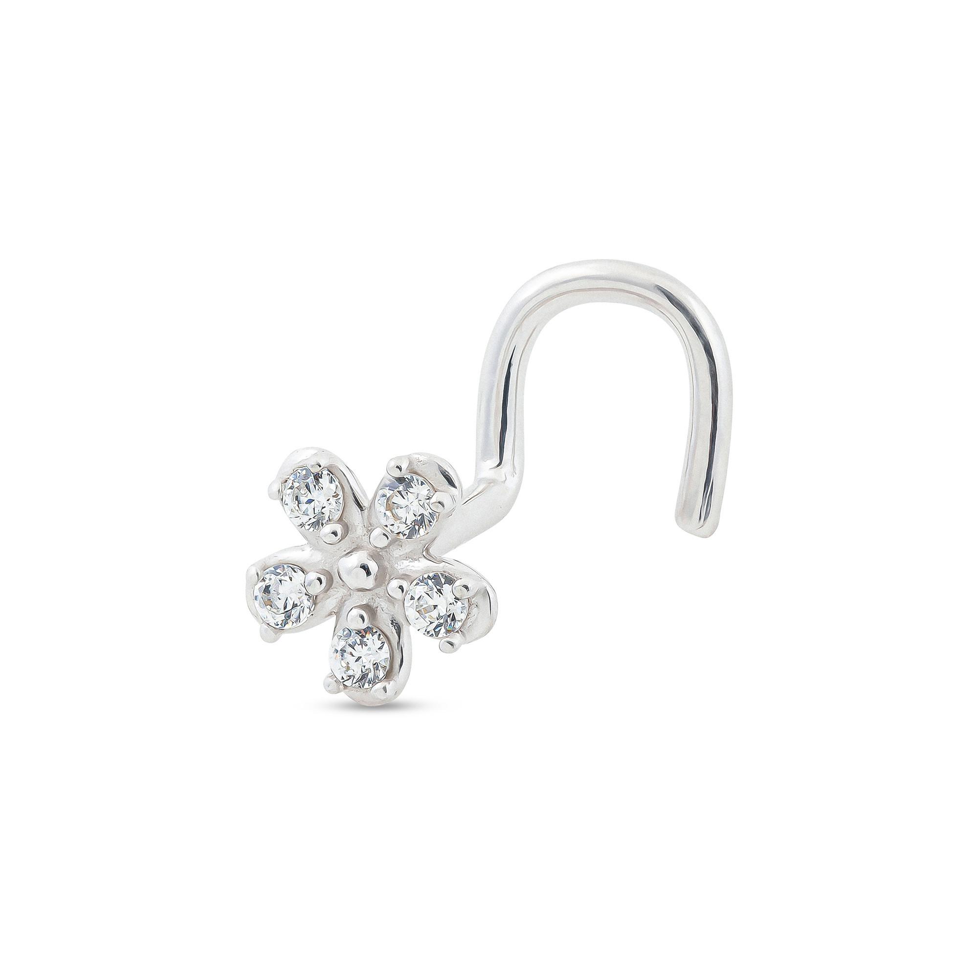 Questo piercing da naso firmato Studio Marquise è realizzato in oro bianco 18 carati con una forma a fiore in filigrana incastonata di zirconi. I gioielli sono dotati del classico gancio.