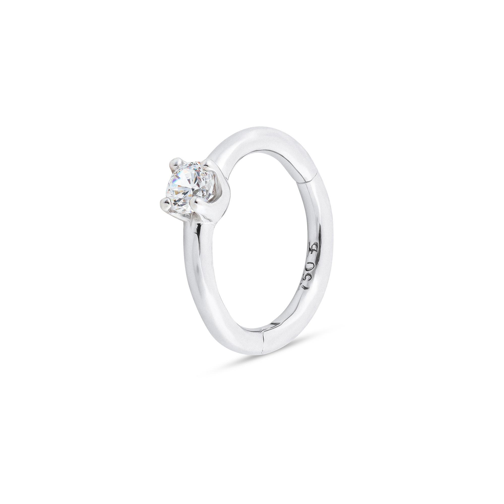 Questo piercing da naso firmato Studio Marquise è realizzato in oro bianco 18 carati con uno zircone intarsiato in una montatura traslucida. I gioielli sono progettati come un anello con una classica chiusura a cerchio.
