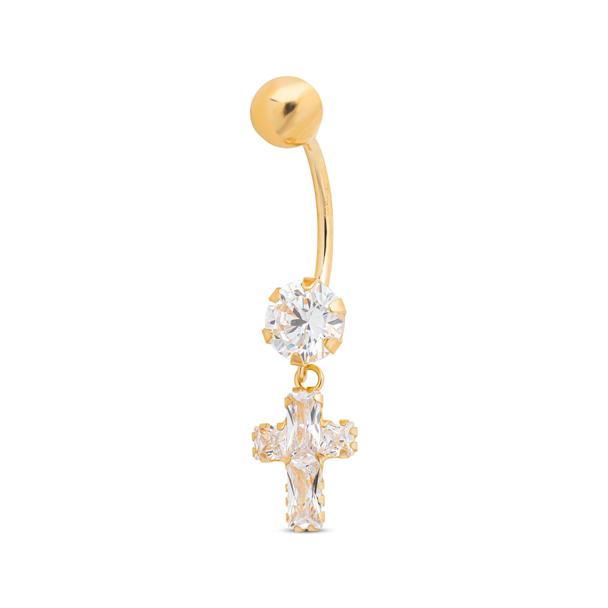 Questo piercing per l'ombelico con ciondolo a croce in oro 18 carati firmato Studio Marquise con