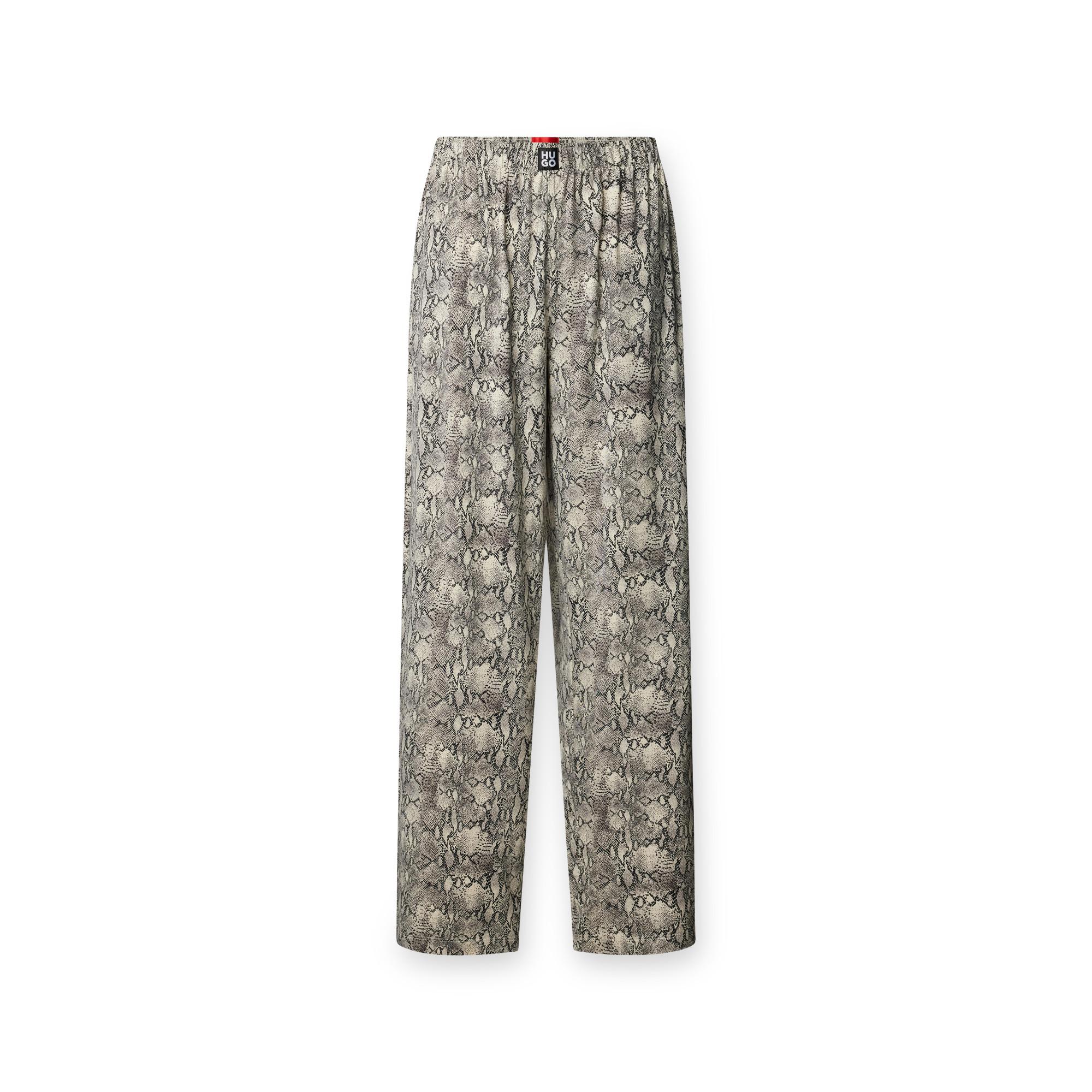 Questo pantalone da pigiama ha una vestibilità a gamba dritta e una fascia elastica in vita. Offre comfort e stile per l'uso quotidiano.