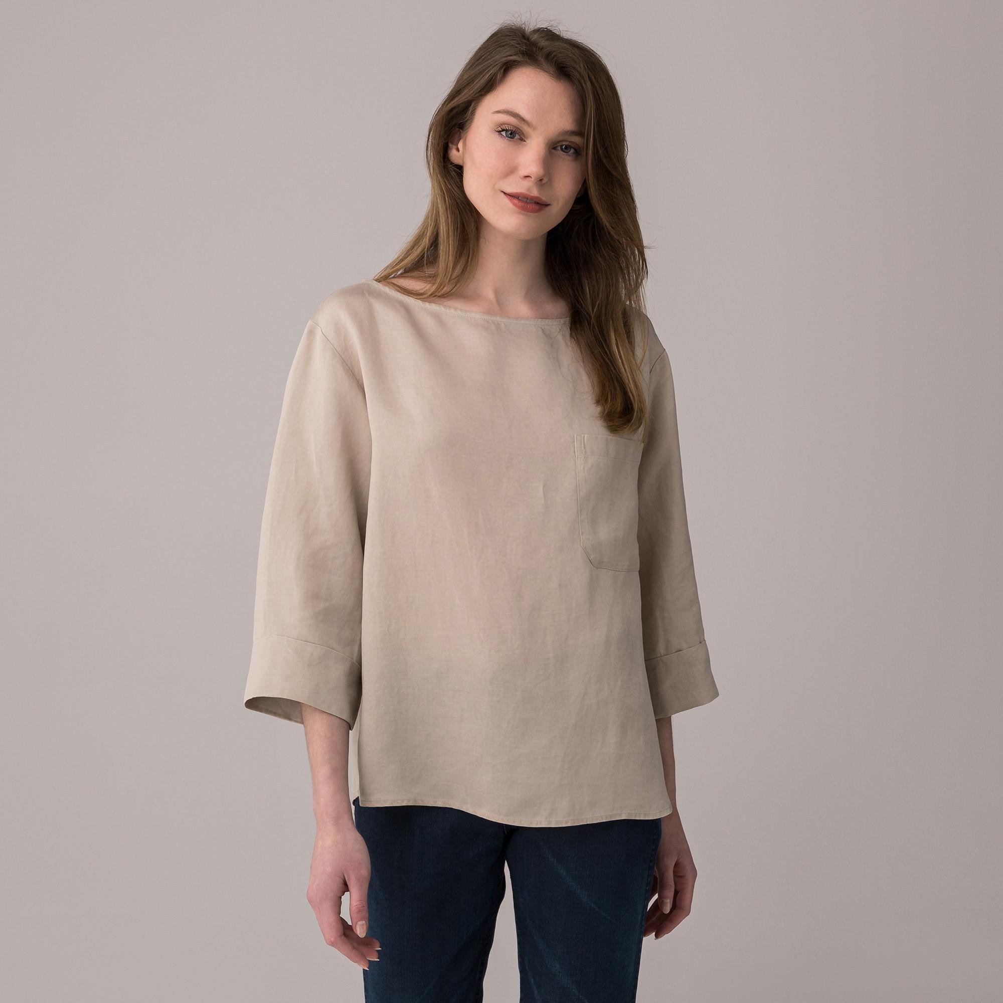 La camicetta convince con il suo design semplice e una silhouette fluida. Lo scollo a barchetta e il taschino sul petto sottolineano il look moderno, mentre il taglio ampio e dritto assicura un elevato comfort. Le maniche a 3/4 fisse e risvoltate aggiungono un tocco casual.
