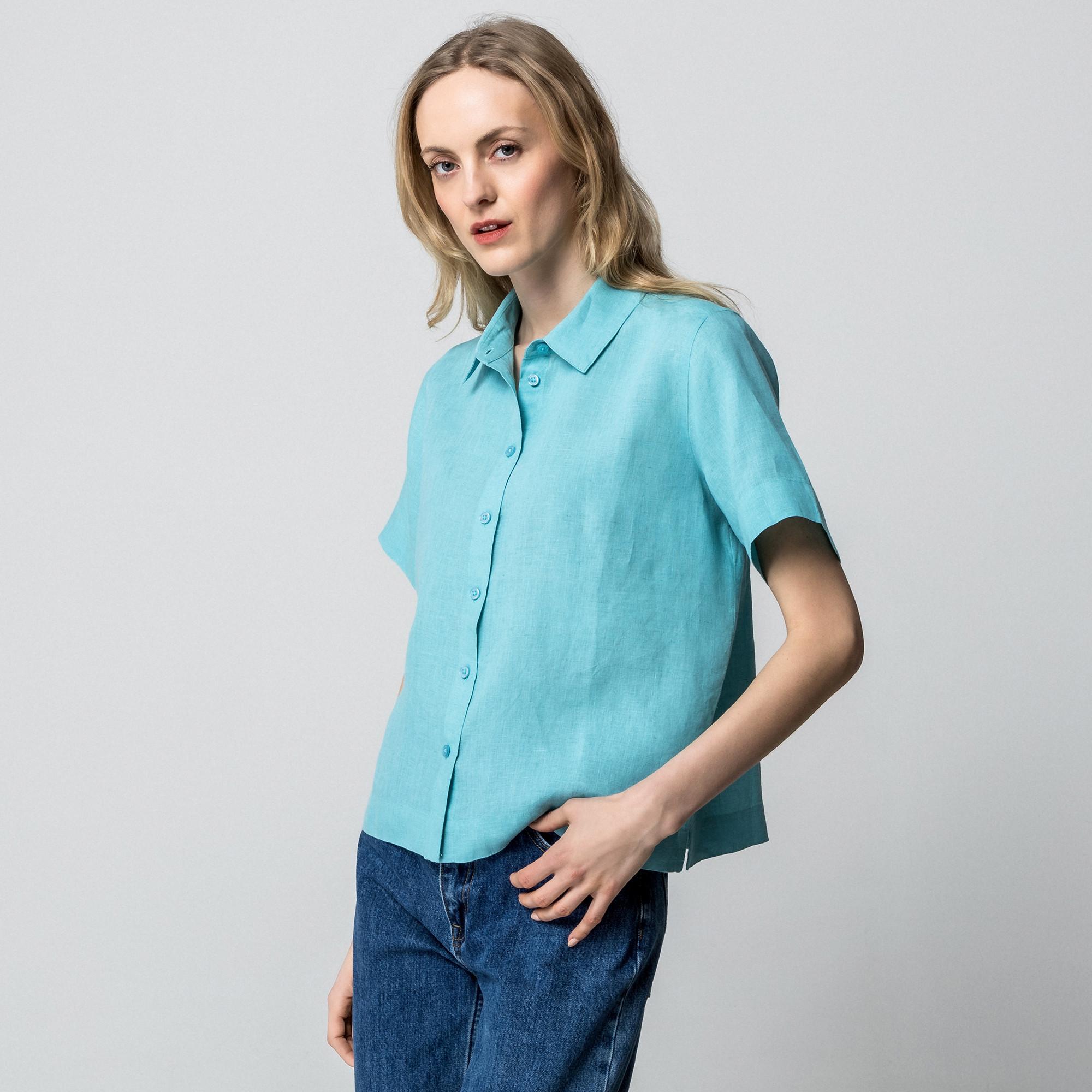 Questa camicetta in lino è un capo versatile con un taglio casual e dettagli di stile. Ha un colletto a revers sottile, è abbottonata su tutta la lunghezza, ha maniche corte e uno spacco sull'orlo.