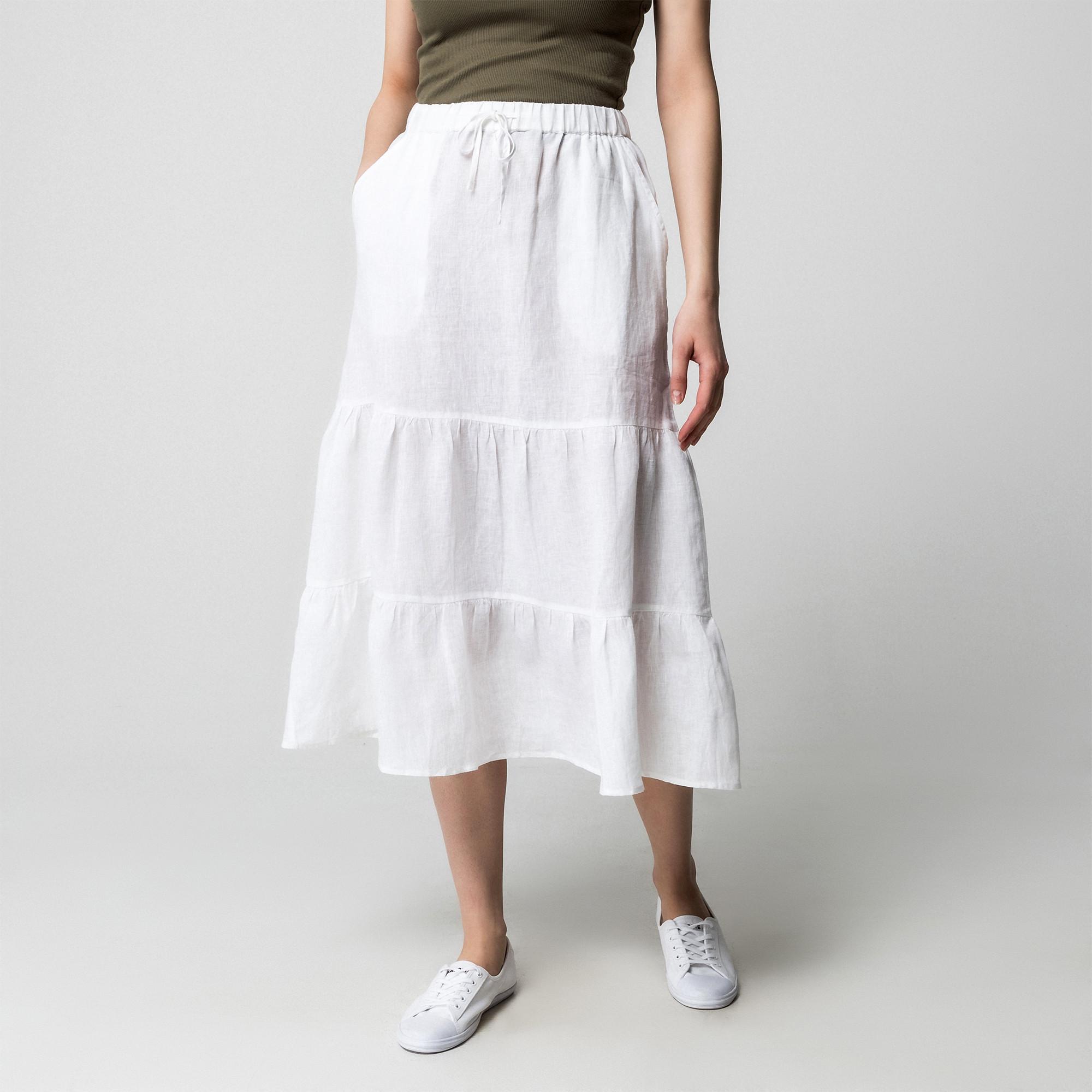 Questa gonna a balze in lino è un capo versatile. Il materiale di tendenza è traspirante, con effetto rinfrescante nelle calde giornate estive.