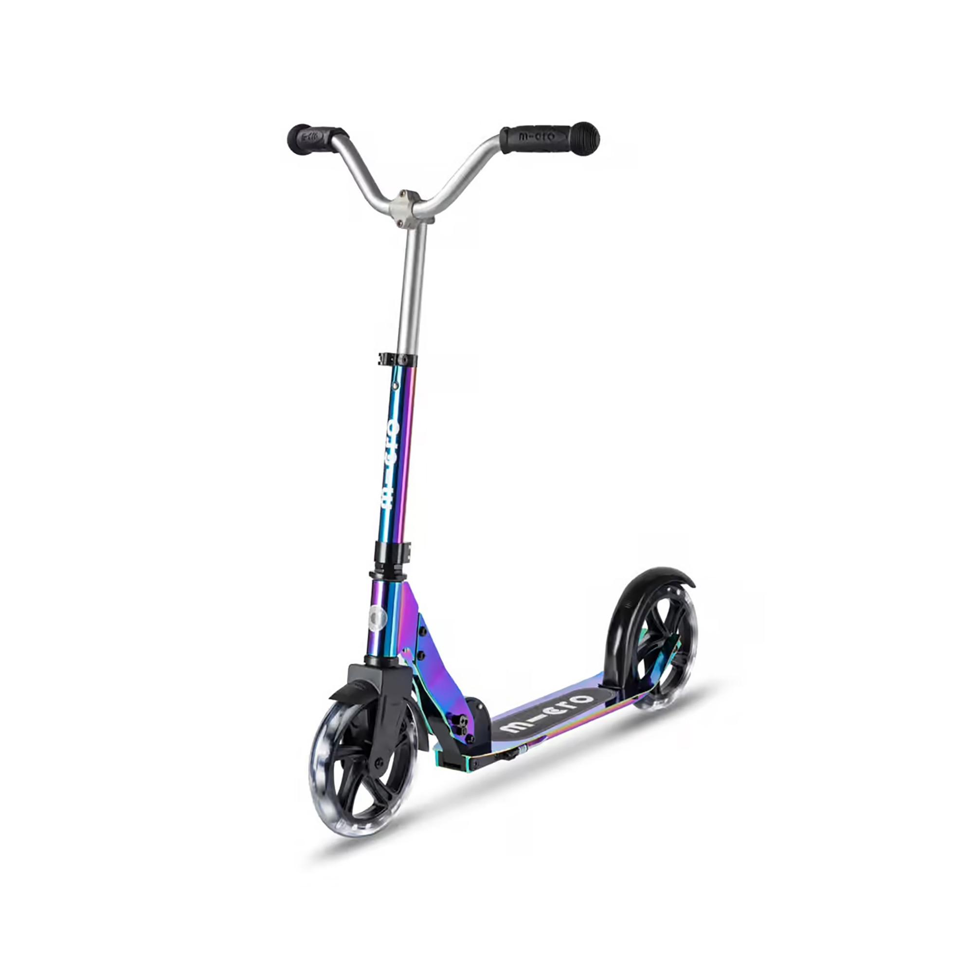 Provate un nuovo livello di divertimento con il Micro Cruiser, ora con ruote a LED e cerchi perfettamente coordinati. Questo monopattino pieghevole è ideale per i bambini che amano andare in giro con gli amici. Il manubrio extra-largo e curvo e la pedana compatta assicurano il massimo comfort e controllo. Le ruote illuminate a LED rendono ogni corsa un momento di gloria e fanno sicuramente girare la testa. I cerchi coordinati completano perfettamente il design elegante. Lasciate che il vostro bambino si lanci in un look unico e riscopra il mondo: non c'è niente di più elegante di questo!