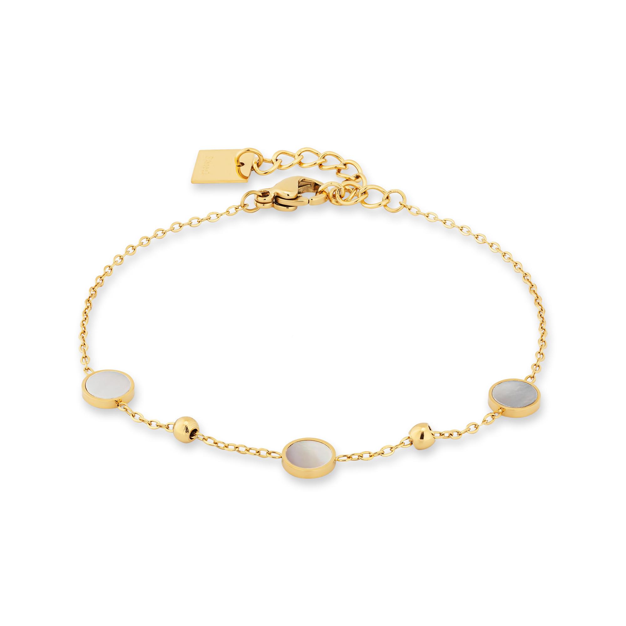 Questo bracciale firmato Zag Bijoux in acciaio inossidabile con finitura dorata e ciondoli in madreperla è un gioiello giocoso dal carattere bohemienne.