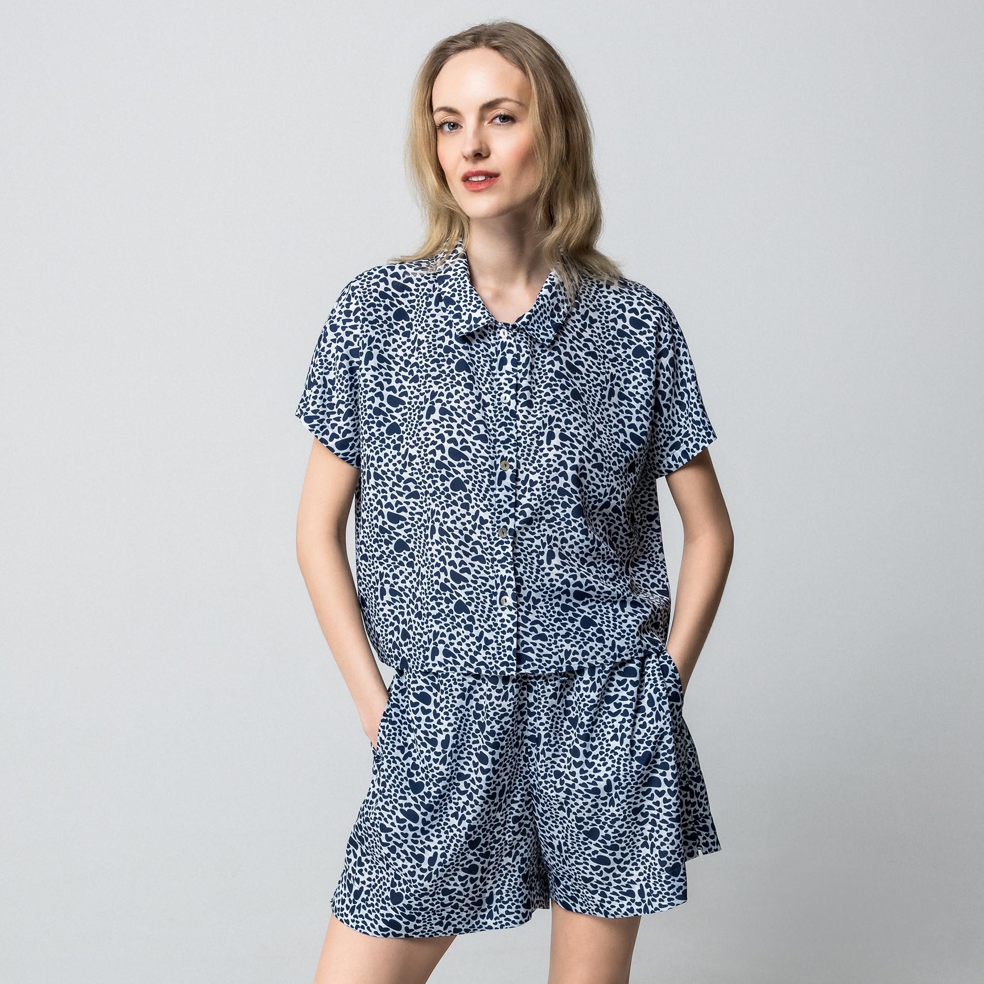 Questa camicetta è un capo semplice per tutti i giorni che completa perfettamente molti stili grazie al taglio ampio e al motivo giocoso integrale. Presenta un classico colletto a camicia, spalle scese e maniche corte.