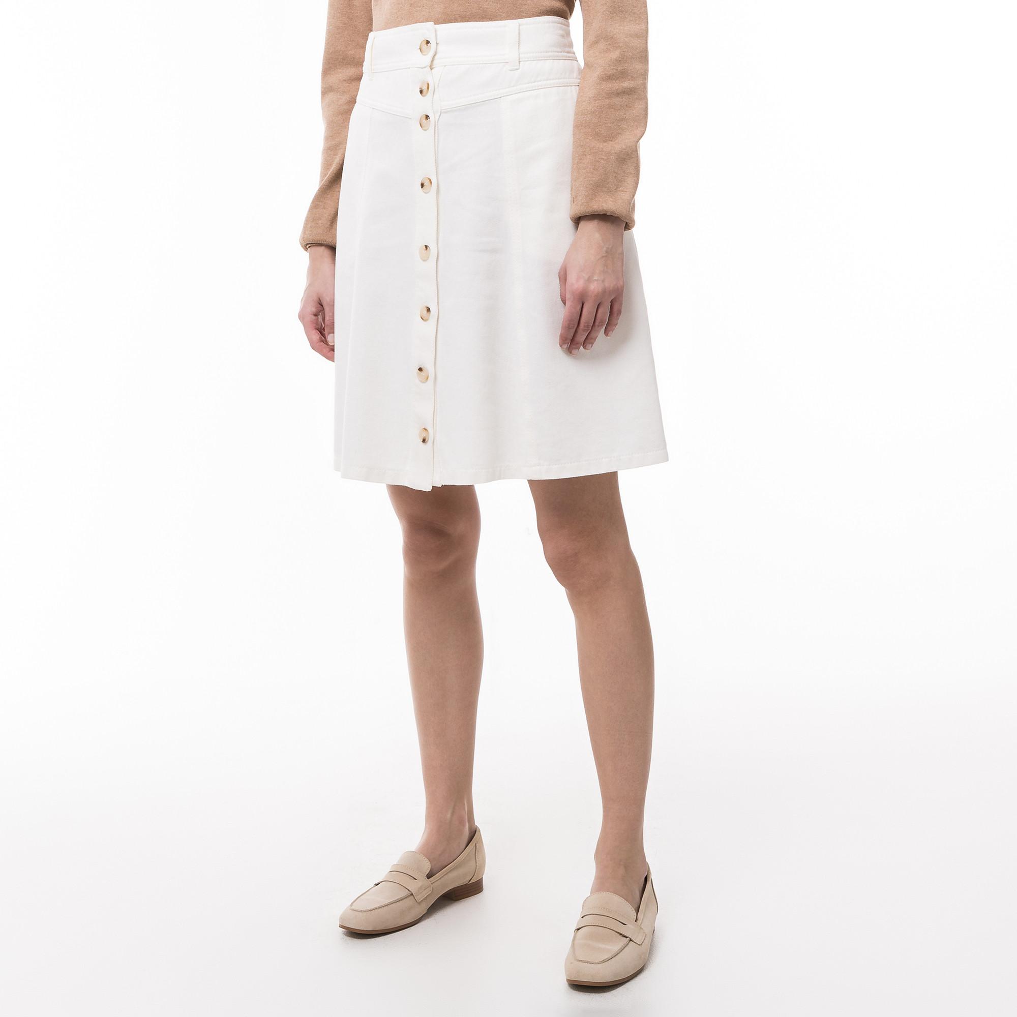 Questa gonna per il tempo libero presenta una classica silhouette a trapezio con chiusura a bottoni su tutta la lunghezza, offrendo un'aggiunta intramontabile e versatile a qualsiasi guardaroba. Il design include pratiche tasche laterali e una comoda cintura, rendendola adatta a varie occasioni casual.